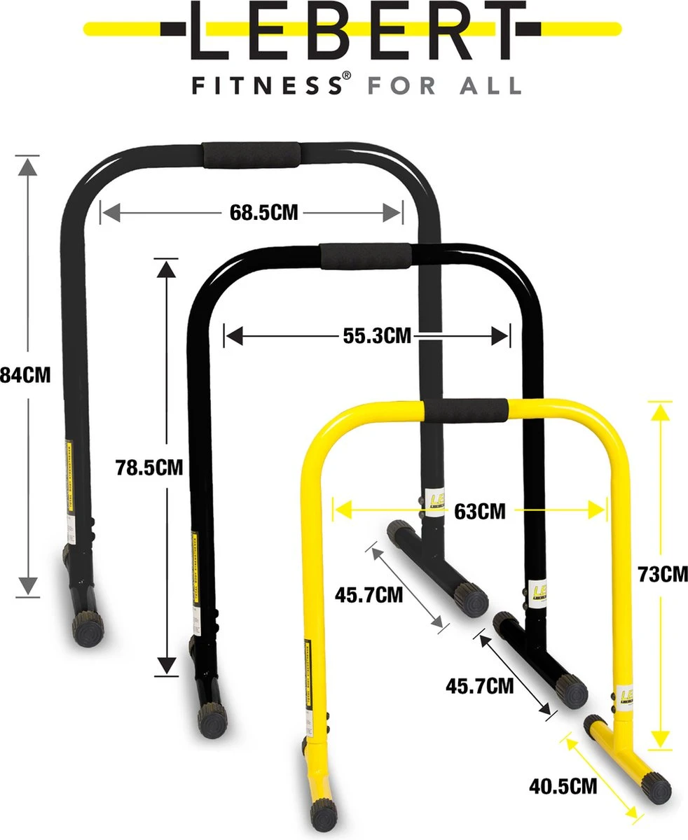 De gebruiksmogelijkheden van de Lebert Equalizer zijn vrijwel onbeperkt; opdrukken, dips, optrekken, beenheffen, zijwaarts beenheffen.