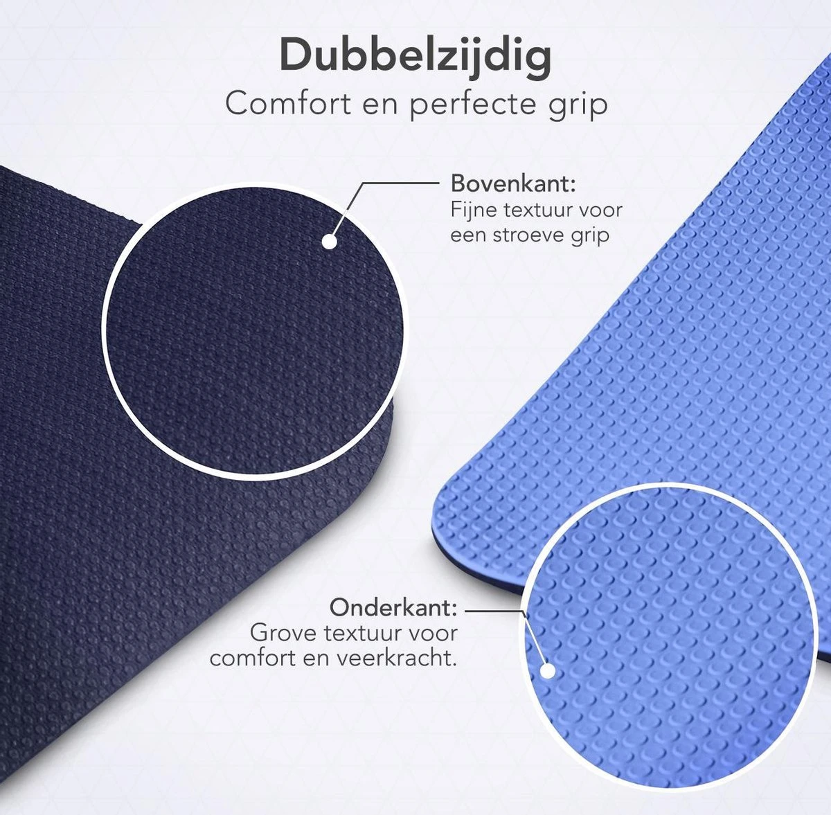De zwarte bovenkant van de yogamat heeft een fijne textuur zodat je niet wegglijdt tijdens je oefeningen. De groene onderkant heeft juist een grove textuur voor meer grip op de vloer. Door deze dubbele laag geeft de mat extra veerkracht en comfort. Daarnaast is de mat zeer elastisch wat betekent dat de mat met jou meebeweegt tijdens het sporten. Geniet van een optimale ondersteuning tijdens het sporten met deze 6mm dikke yogamat van LifeGoods!