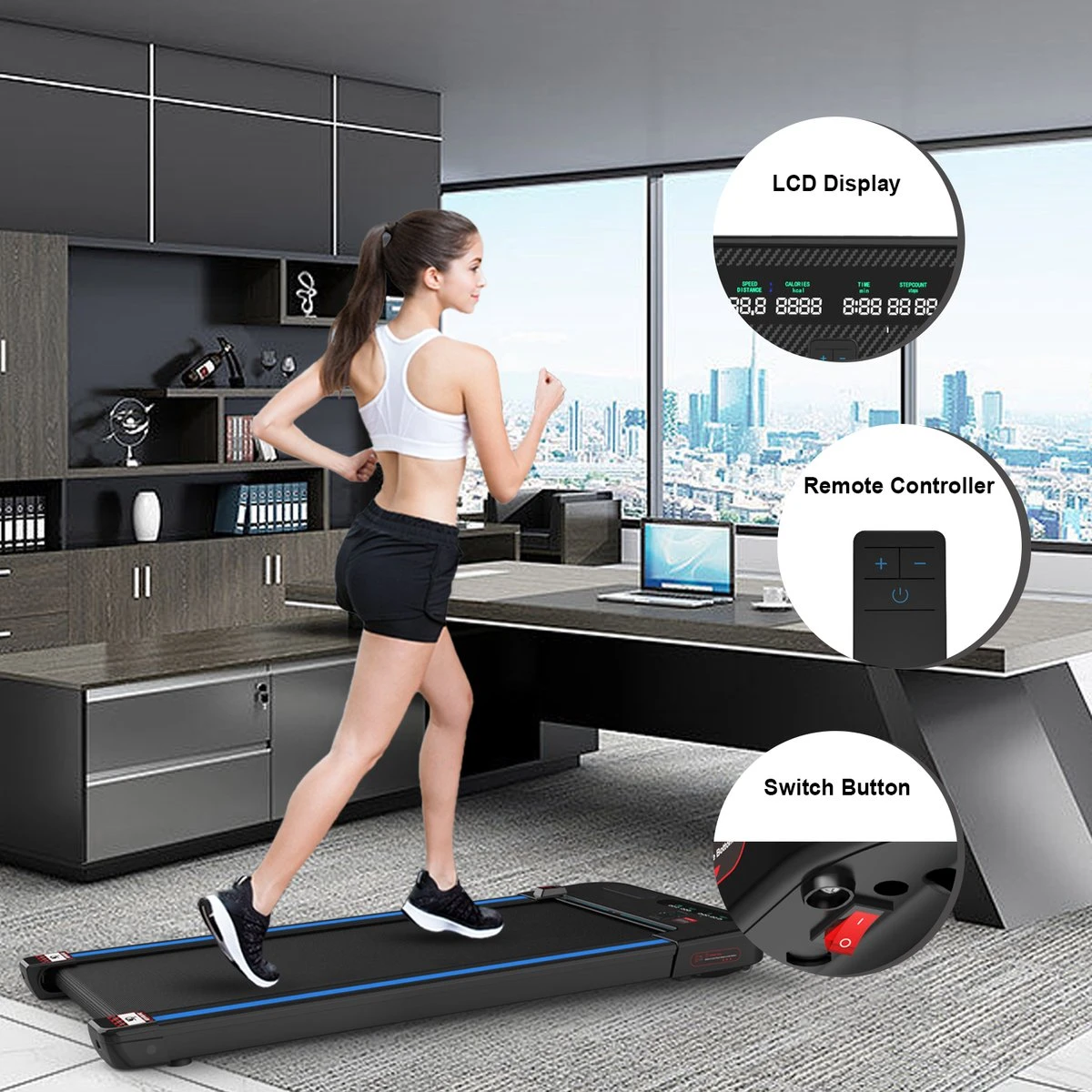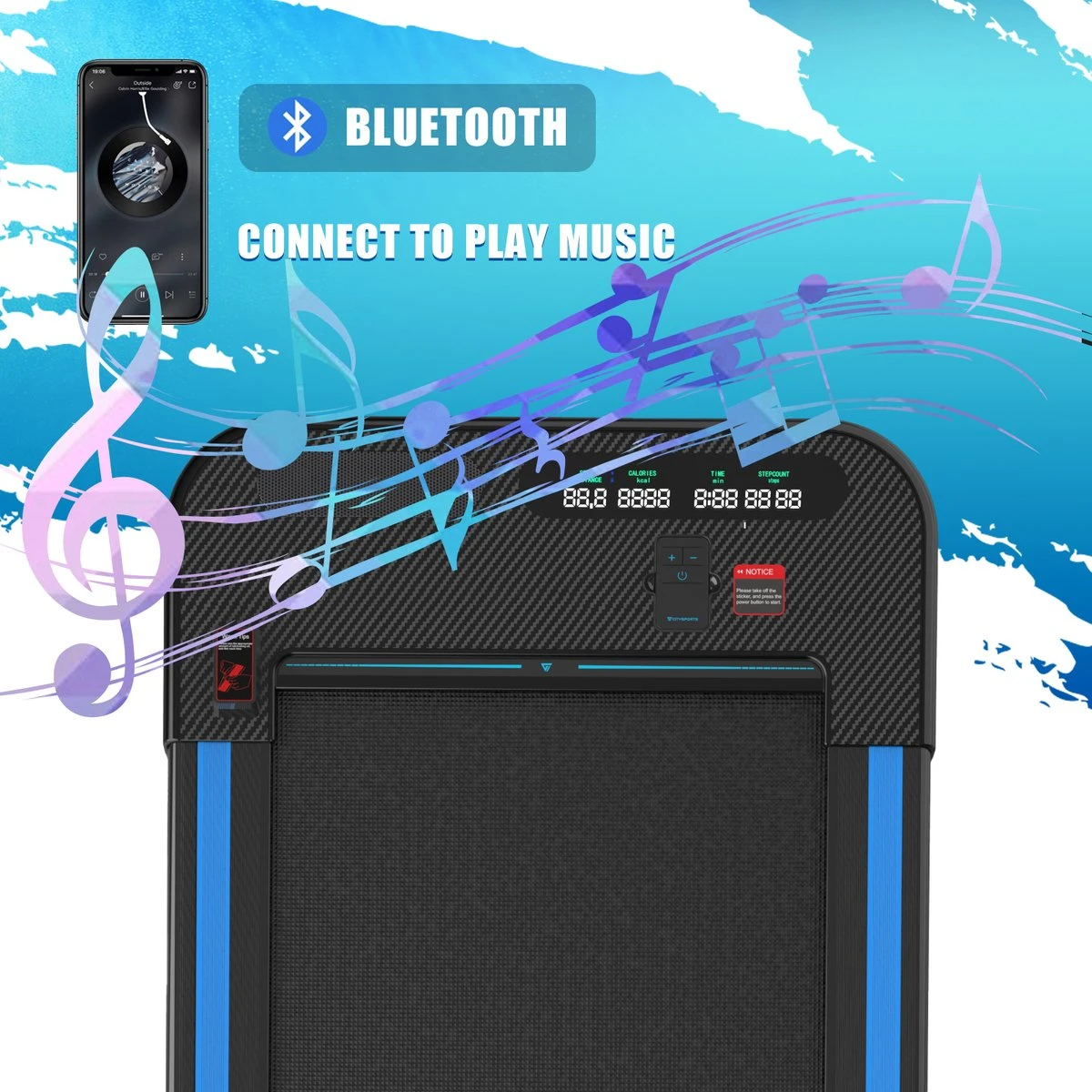 Bovendien gaat het loopvlak schommelingen effectief tegen. Het veert bij elke stap terug en absorbeert zo onwenselijke stoten tegen de gewrichten. Het LCD-scherm is eenvoudig te bedienen en geeft een omvattend overzicht van alle relevante waarden, zoals tijd, snelheid, aantal verbrande calorieën en afstand. De loopband kan gemakkelijk met de transportwielen worden verplaatst naar waar de actie plaatsvindt. Tijdens de training kan er via Bluetooth naar muziek geluisterd worden.