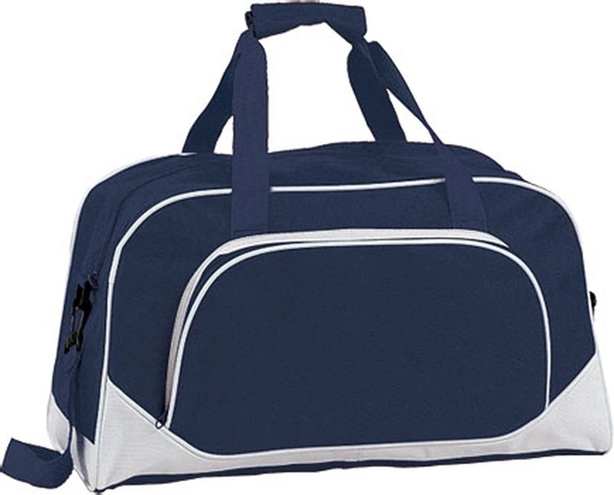 Navy blauwe sporttas 42 cm. Praktische sporttas in de kleur navy blauw voorzien van 1 groot ritsvak, 1 voor vak en een verstelbare draagband. Formaat: ongeveer 42 x 24 x 20 cm.