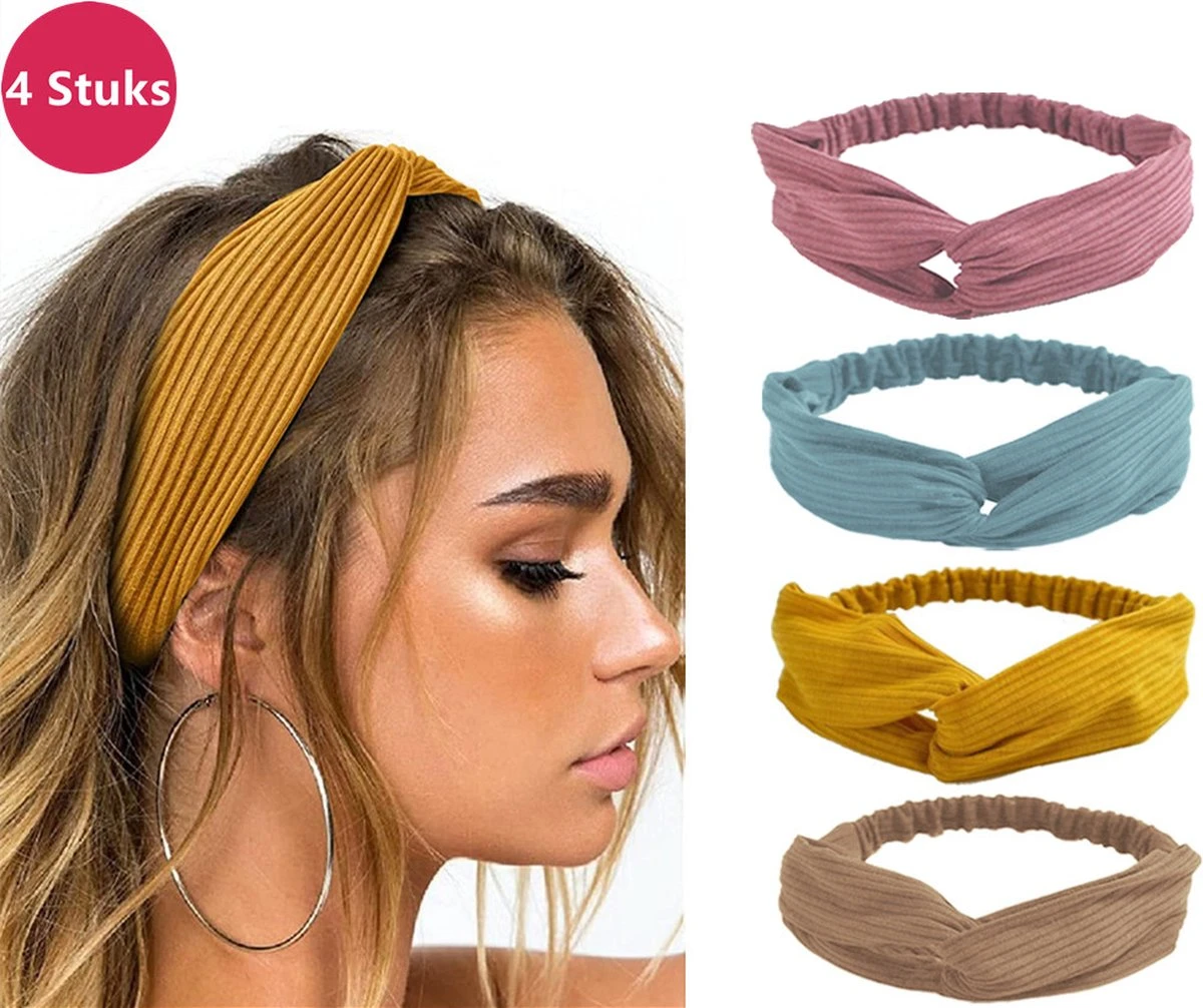 Merkloos Set Van 4 Stuks – Dames Haarbanden – Kleur 2 – Knoop Cross Knitted Haarbanden – Dames – Haarband Volwassenen – Elastisch – Vrouwen – Meisjes – Yoga – Haaraccessoires
