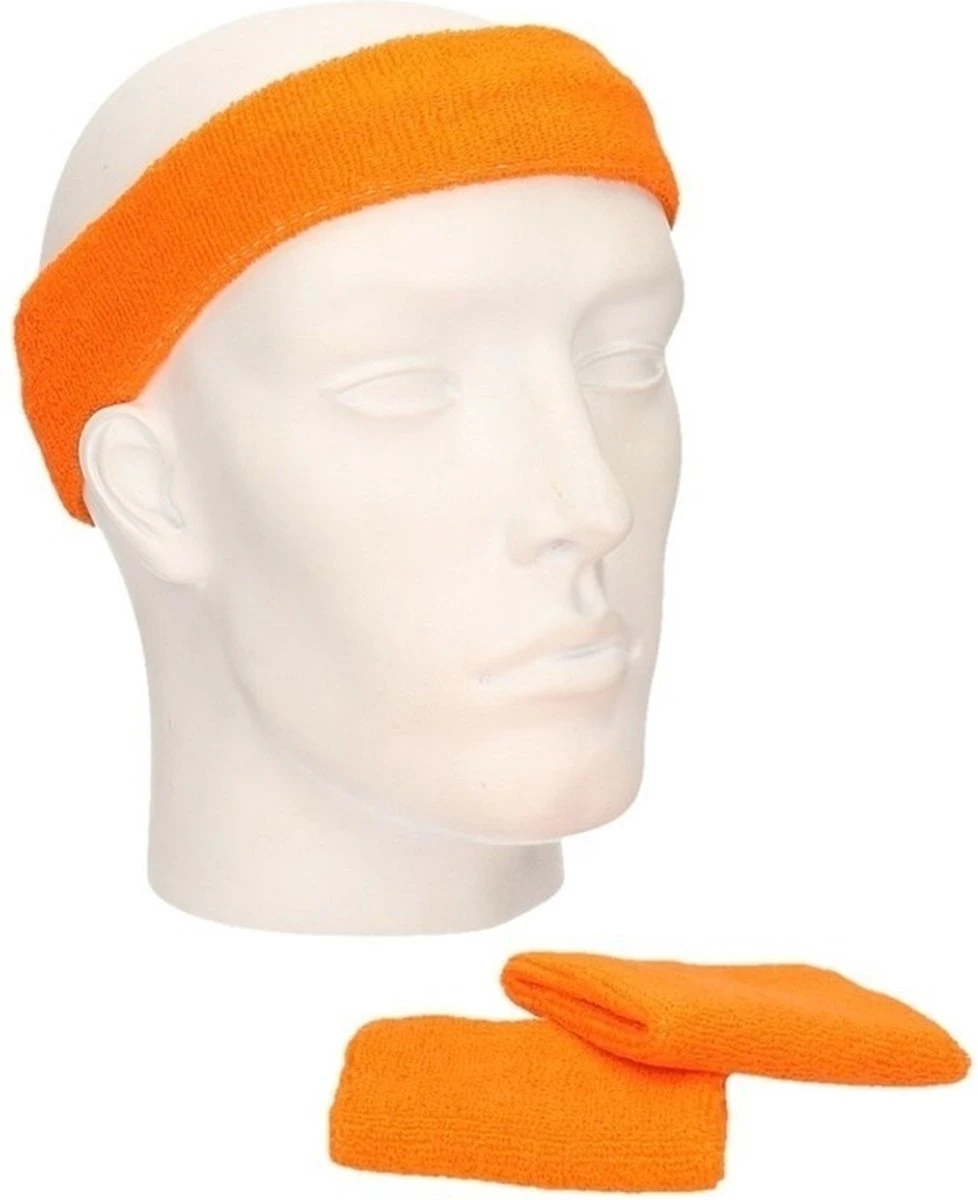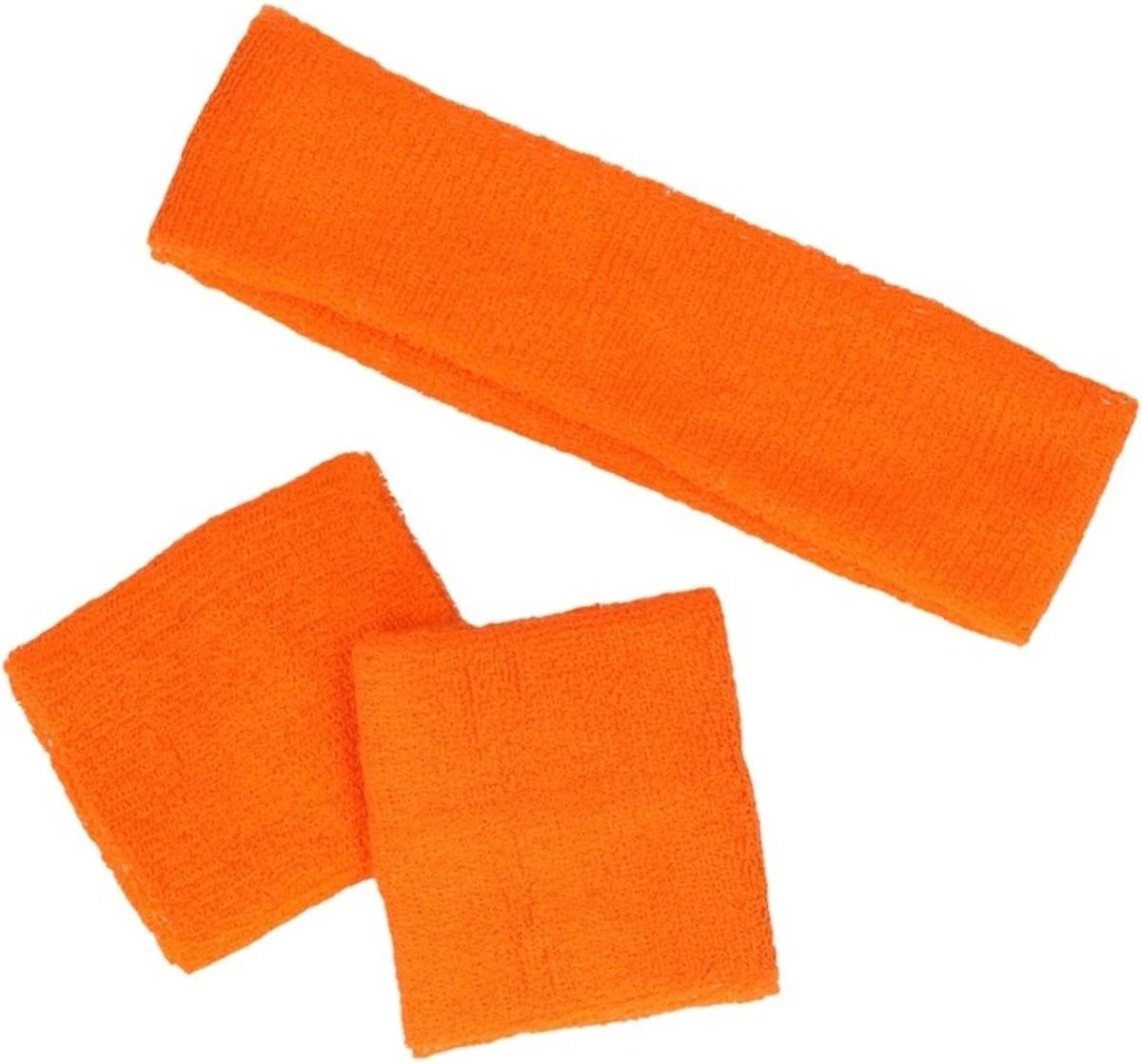 Zweetbandjes set in de kleur oranje. Dit setje bestaat uit twee polsbandjes en een hoofdband. De polsbandjes zijn 8 cm breed. De hoofdbandjes zijn ongeveer 6 cm hoog en hebben een omvang van ca. 58 cm. Materiaal: 80% katoen en 20% elastaan. Gekleurde zweetbandjes voor een sportdag of evenement.