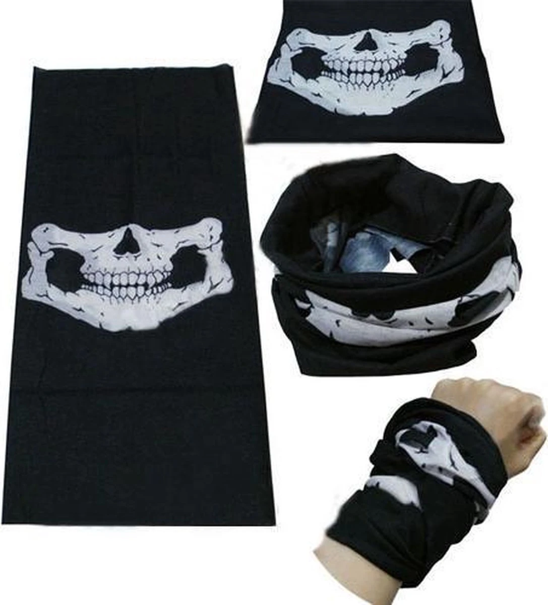 Aan de voorkant is een eng doodshoofd zodat je er schikachtig uit ziet tijdens het skiën, airsoft of op de motor. Als je de slaat omdraait is het gewoon een zwarte col. Leuk en lekker warm