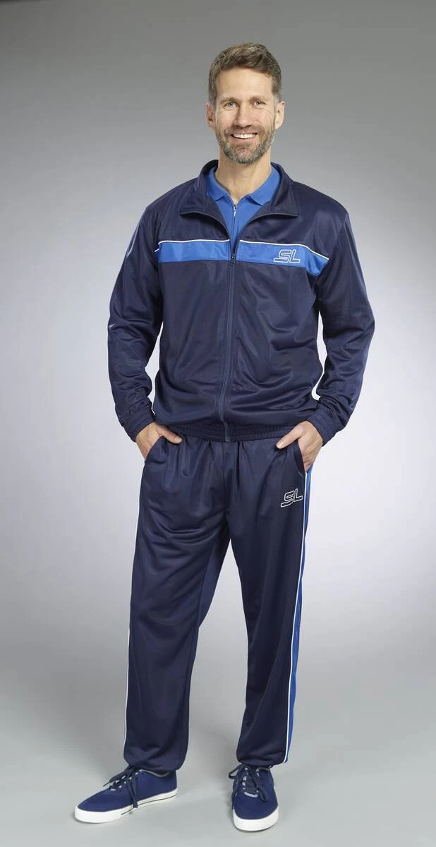 Trainingspak bestaande uit een jasje en maar liefst twee broeken. Hierdoor kan je tussendoor van broek wisselen zonder daarvoor een extra was te hoeven draaien.