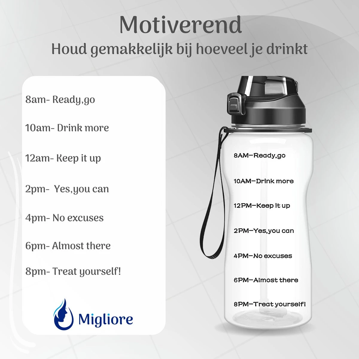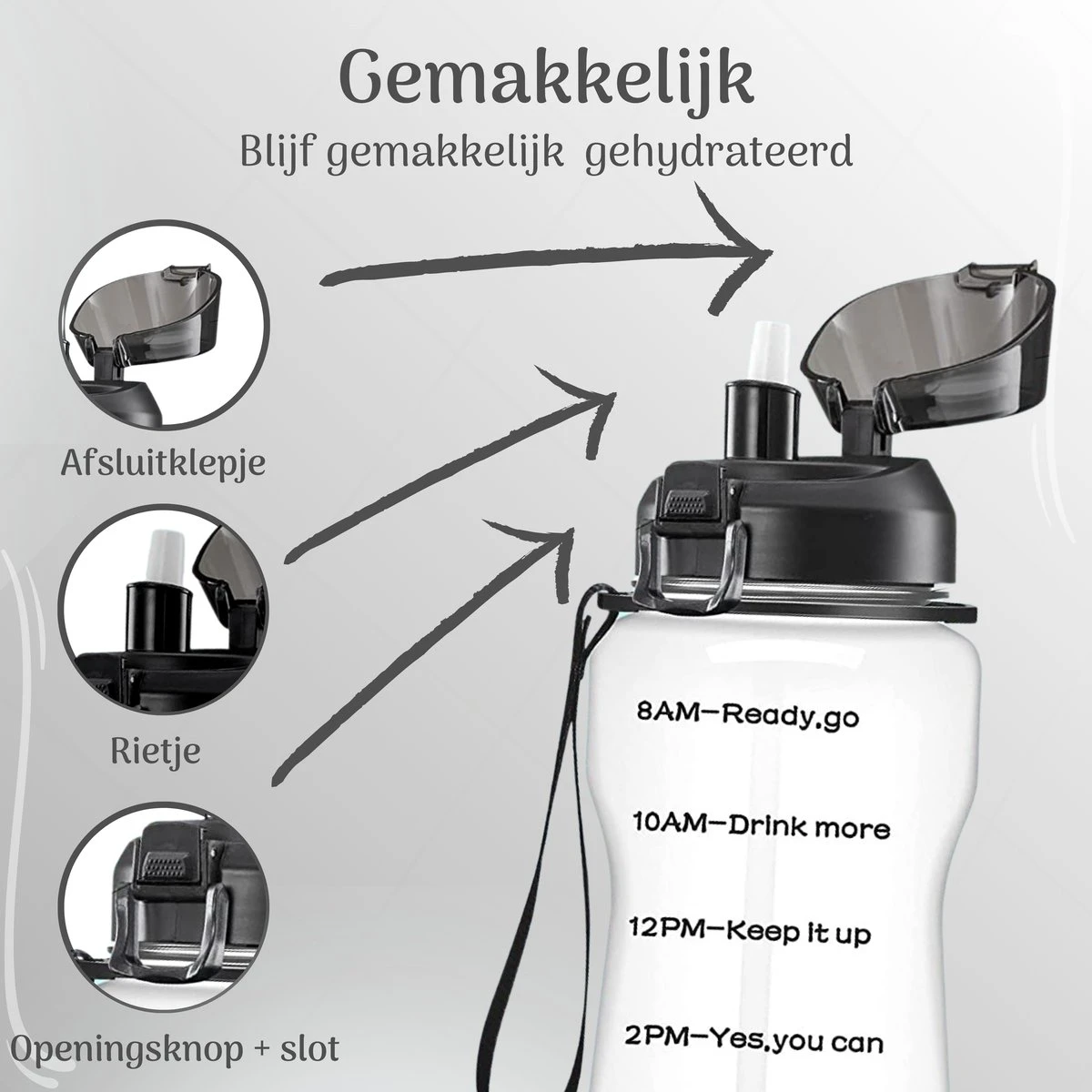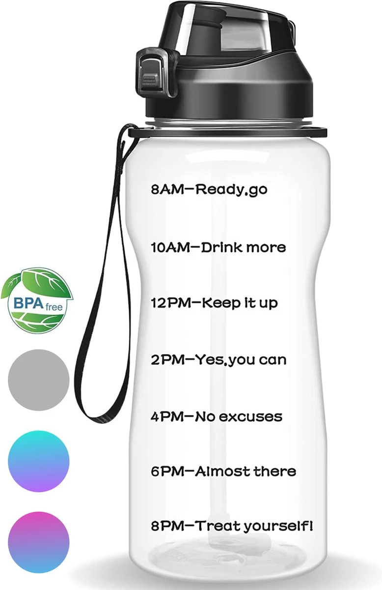 De fles is voorzien van enkele motiverende teksten om jou dat extra zetje in de rug te geven! Vul de fles elke dag, zodat je weet dat jij voldoende water hebt binnengekregen.