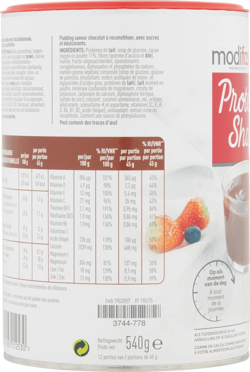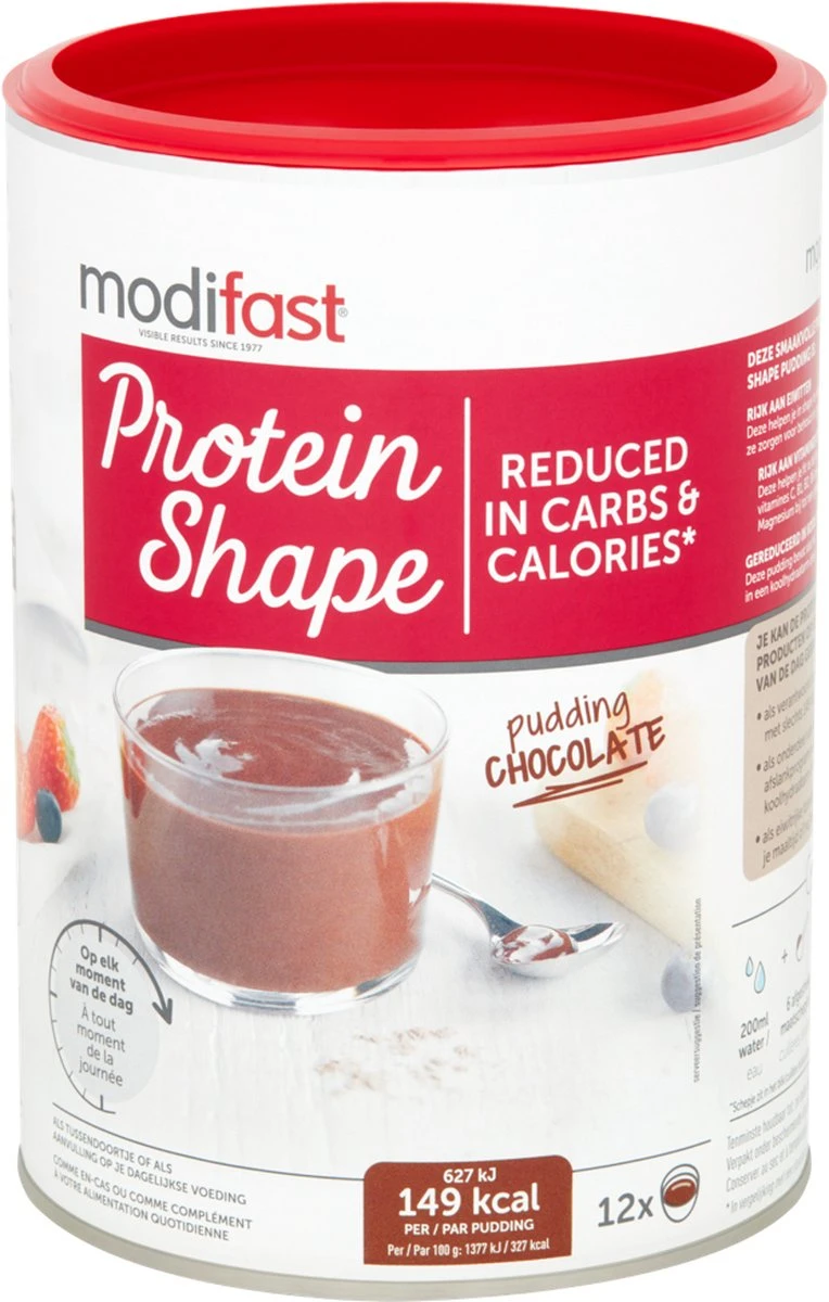 Modifast Protein Shape Pudding Chocolade is een eiwitrijke pudding met een heerlijke chocoladesmaak. De pudding is gereduceerd in koolhydraten en bevat slechts 149 kcal per portie.Ideaal om in shape te komen en te blijven.