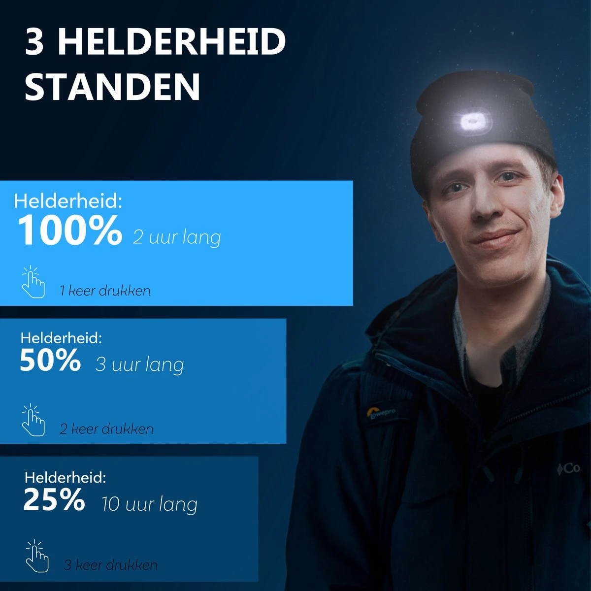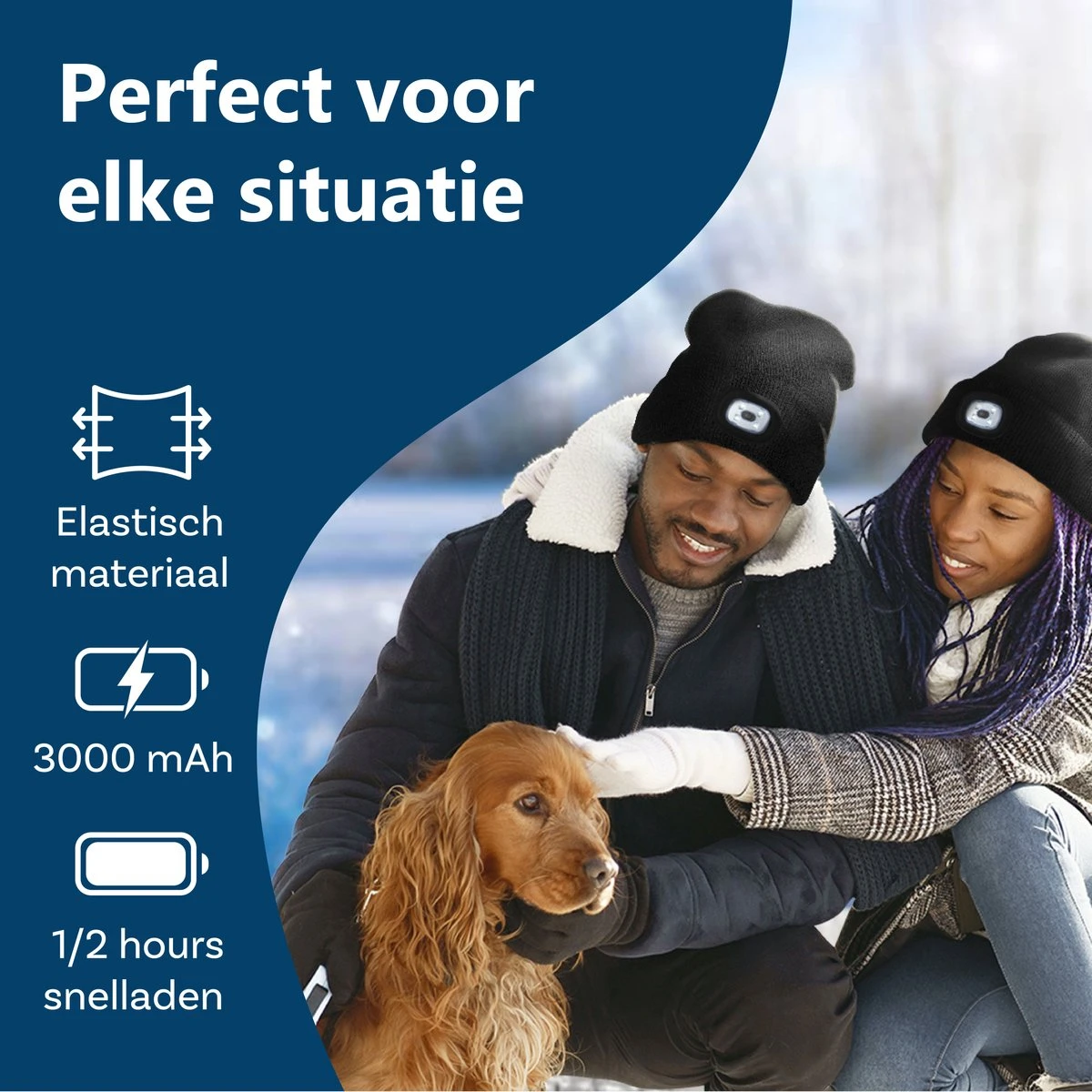 Ben jij vaak in het donker buiten te vinden en zou jij meer willen zien terwijl jij je handen vrij houdt? Dan is deze muts met LED-verlichting precies waar jij naar opzoek bent. De beanie biedt jou niet alleen warmte en comfort, maar is ook geschikt als een hands-free zaklamp die tot wel 10 uur lang licht geeft in het donker. De muts is perfect voor joggen, wandelen, kamperen, de hond uitlaten, werken of andere activiteiten buitenshuis in het donker. Het perfecte cadeau voor elk buitenmens!