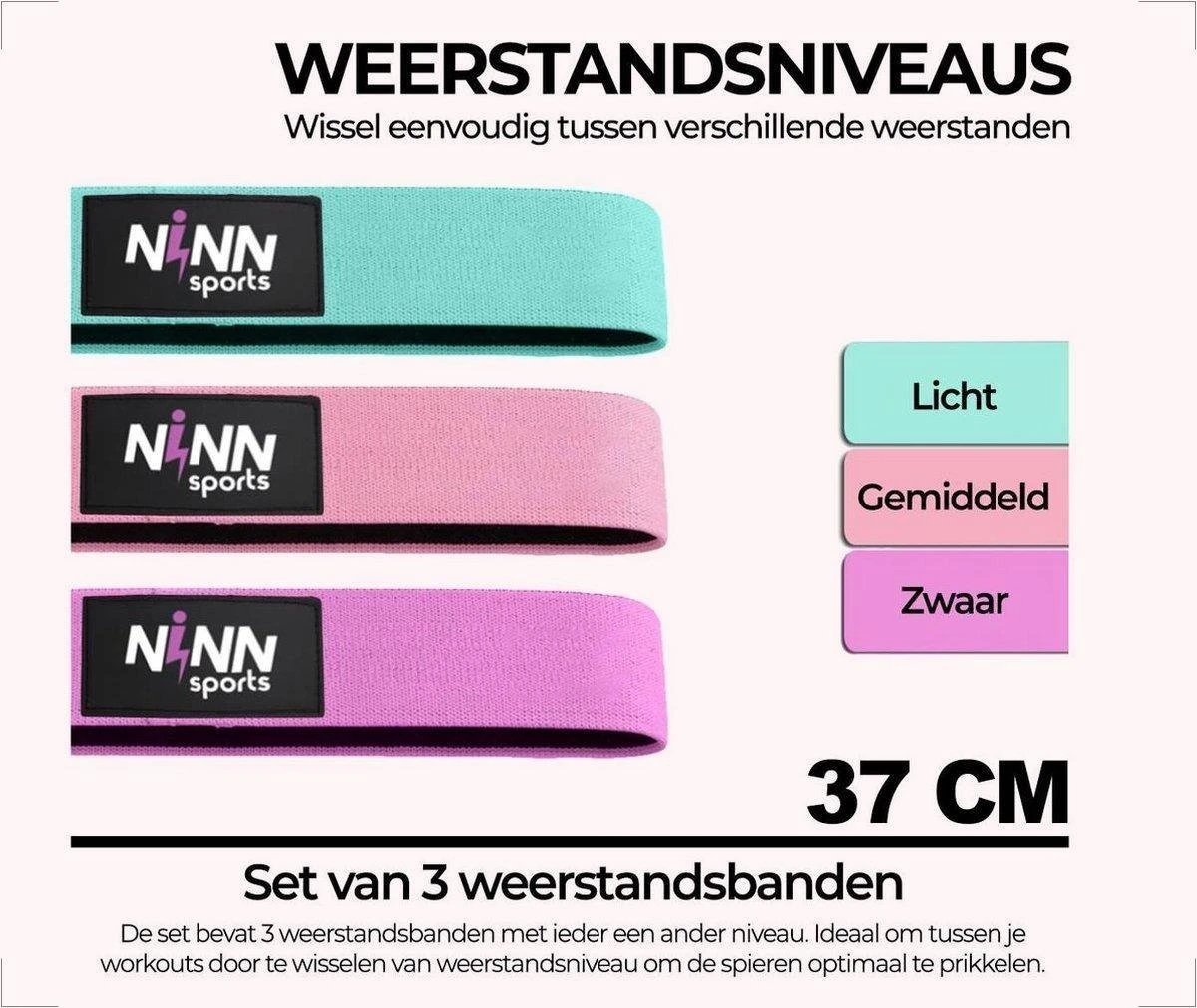 Je ontvangt drie banden met dezelfde maat (37CM). De weerstand van elke band is verschillend van licht tot zwaar. Het is ideaal om tussen de trainingen door gemakkelijk te wisselen van weerstandsniveaus. De banden worden verkocht in een handige mesh draagtas.
