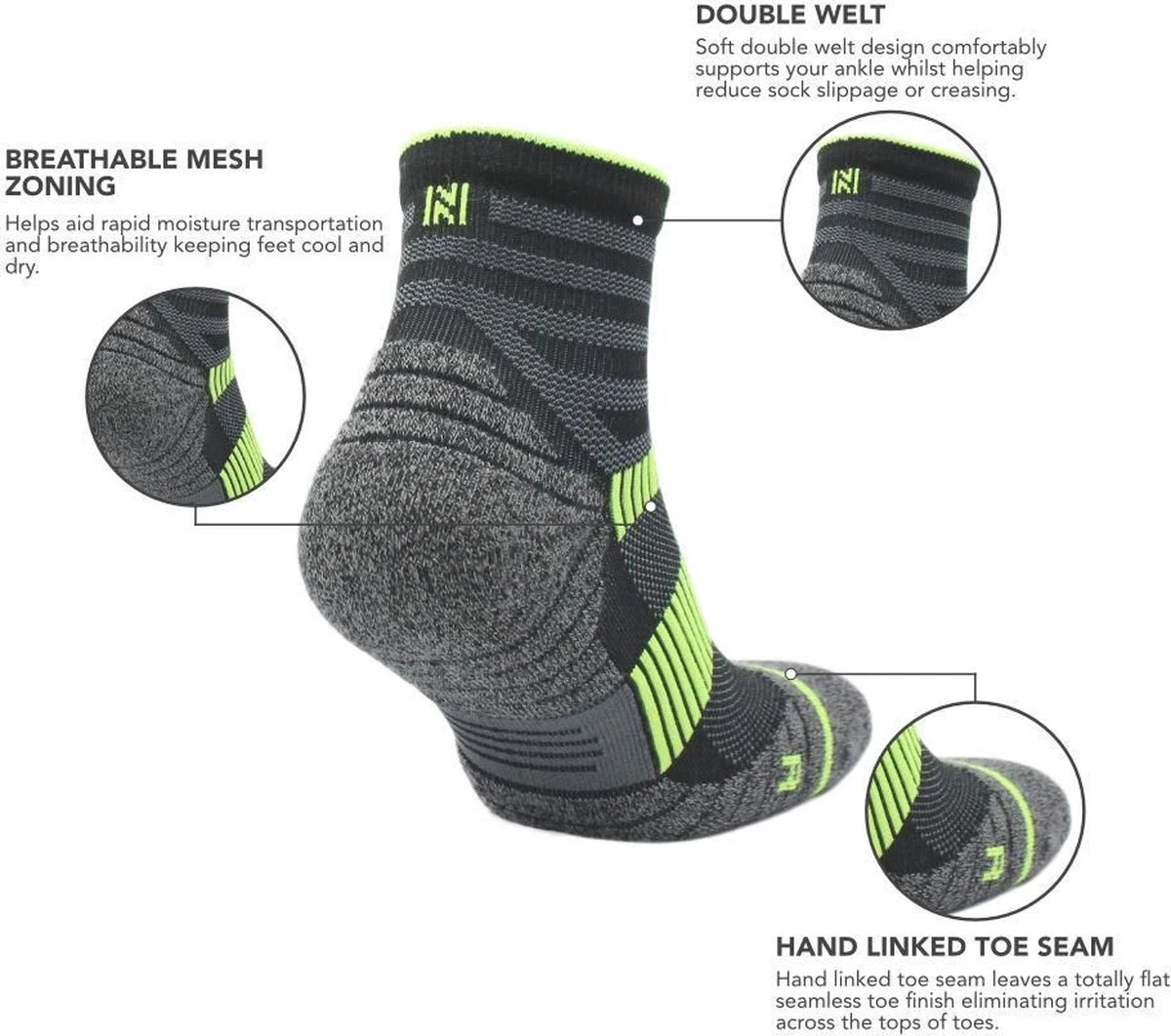Norfolk’s Cougar Ankle Dry Touch Running Socks are manufactured using Prolen® Yarn, which expels humidity by creating a dry touch layer, keeping feet feeling dry, cool and comfortable during your day.