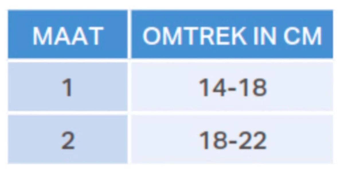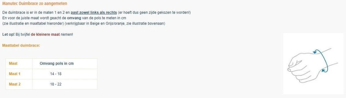Uw maat bepalenHet bestellen van de juiste maat is belangrijk. De Orliman Manutec Duimbrace is zowel links als rechts te dragen en verkrijgbaar in 2 maten; maat 1 (polsomvang 14-18 cm) en maat 2 (polsomvang 18-22 cm). Daarnaast is deze duimbrace te verkrijgen in 2 verschillende kleuren; grijs/oranje of beige/huidskleur (zie bovenstaande foto’s). Maat Polsomvang (cm)1 14 – 182 18 – 22