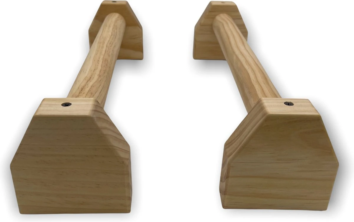 Sta jij regelmatig op jouw handen in een handstand of push up houding? Deze houten Parallettes zijn ideaal om met je eigen lichaamsgewicht te trainen binnen en buiten. De houten handvat gemaakt van natuurlijk beukenhout is perfect afgestemd op uw hand met een perfecte grip, zelfs met zweterige handen. Met onze Parallettes creëer je een stabiele houvast die je helpt (pols) blessures te voorkomen. Door de optimale dikte van de handgrepen kan je nu met gemak diverse oefeningen en elementen zoals push ups, handstanden en L-sits oefenen. Je gebruikt bij deze oefeningen heel veel verschillende spiergroepen tegelijkertijd. Zo train je er onder andere je borst, triceps, de voorkant van je schouders, je buikspieren en al je armspieren mee. Verder hebben deze parallettes een antislip laag aan de onderzijde, hierdoor liggen ze stabiel op de ondergrond en kun je ze op elke ondergrond gebruiken zonder dat ze van elkaar afschuiven.