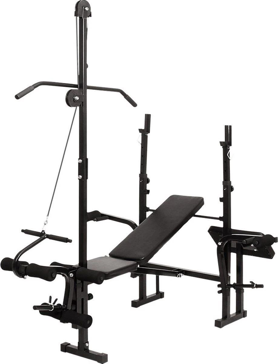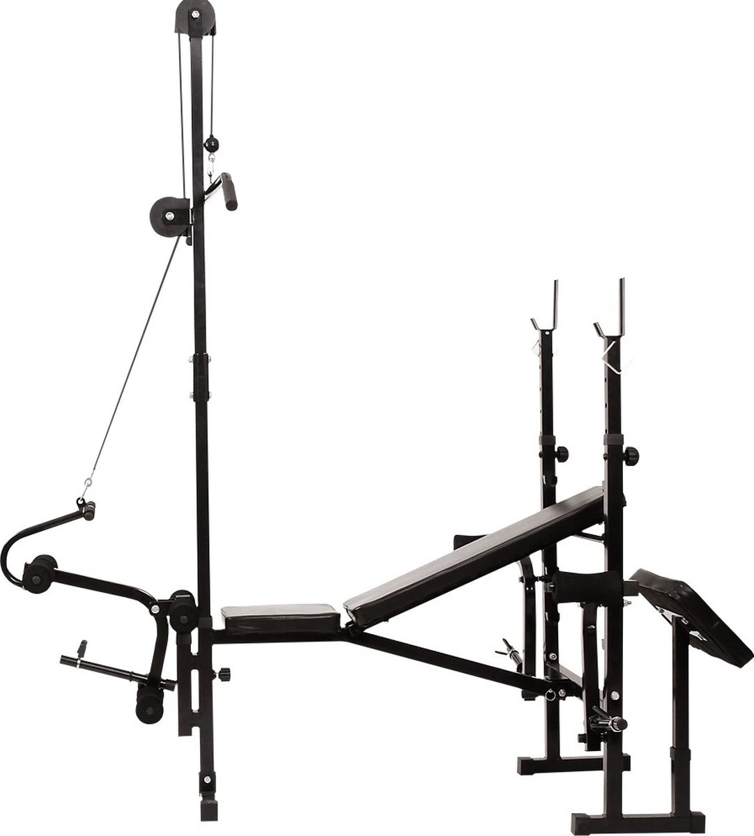 Multifunctioneel halterbank voor een veelzijdig spiertrainingen- Geschikt voor beginners en gevorderden- Diverse trainingsmogelijkheden voor een doelgerichte spieropbouwMax. belasting:- langhantelablage: max. 60 kg- latissimusturm: max. 60 kg- Butterfly: max. 25 kg (per kant)- beencurler.: max. 30 kg- Max. lichaamsgewicht: ca. 100 kgVeelzijdigheid:- langhantelablage: in 6 standen verstelbaar- Rugleuning: in 4 standen verstelbaar- curlpult: in 4 standen verstelbaarKenmerken:- Stabiele vierkant stalen constructie- Stabiele kabelzug: ca. Ø 34 en 38 mm- langhantelablage met sicherungsbügel- Praktische snelsluitingen op het turmgerüst en curlpult- 3 sicherungsklammern voor gewichtsschijven- Sterk gecomprimeerd polsterrollen- Eenvoudige montage- Met rubberen anti-slip en vloerbeschermende voetjes- Plaatsbesparend inklapbaarTechnische gegevens:Afmetingen (l/B/H): ca. 170/130/204 cm4 3-voudig verstelbare rugleuning (H): ca. 42 – 91 cmAfmetingen halterhouder (H): ca. 1145 – 145 cmAfmetingen rugleuning (l/B/H): ca. 74/24/4 cmAfmetingen zitting (l/B/H): ca. 26/24/4 cmAfmetingen curlpult (l/B/H): ca. 38/24/4 cmMaximale belasting: 255 kg (incl. gewichten en lichaamsgewicht)Max. belasting beinverlängerung; 25 kgMax. belasting beinübungen: 50 kgMax belasting langhantelauflage: 60 kgMax. belasting schouders: 25 kgMateriaal: staal kunstleer kunststofKleur: zwartInhoud:1 x halterbank hntlb10 (als bouwpakket voor zelfmontage)1 x verkrijgbaar montagehandleiding (de FR en)