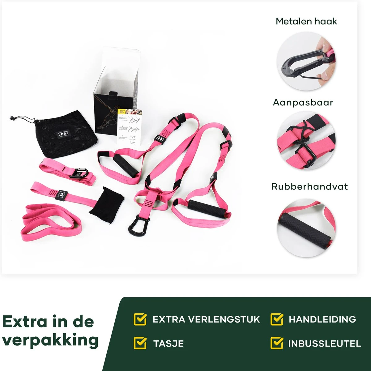 Dankzij de verstelbaarheid is de set geschikt voor iedereen. Daarnaast train je met je eigen lichaamsgewicht en kan je door de uitvoering van de fitness oefeningen de training zo zwaar maken als je zelf wilt.