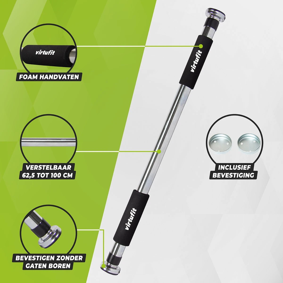 De optrekstang van VirtuFit is een stevige stalen stang met een chromen afwerking, zodat corrosie wordt voorkomen. Bij de pull up bar worden 6 schroeven meegeleverd om de stang nog steviger te monteren. De foam handvaten zorgen voor extra comfort tijdens de training. Gelukkig duurt het monteren van de deurrekstok in een deuropening of tussen 2 muren slechts een paar minuten waardoor je binnen no time kan beginnen met het uitvoeren van krachtoefeningen. Boren is dus niet nodig! De stang is geschikt voor deuropeningen tussen de 62,5 tot 100 cm en is belastbaar tot een gewicht van 120 kg. Verder is de optrekstang van VirtuFit van hoogwaardige kwaliteit en wordt daarom geleverd met een garantie van 2 jaar. Let op: deze optrekstang is ontworpen voor houten deurposten. Metalen deurposten kunnen soms meebuigen waardoor je de stang niet goed kunt bevestigen.