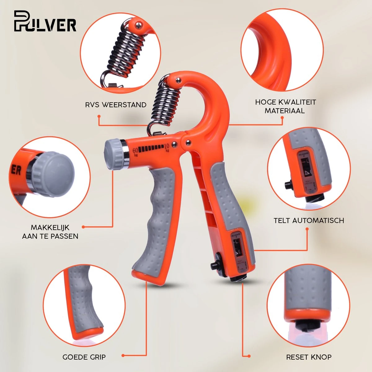 Wil jij jouw grip, polsen of onderarmen versterken? Dat kan met de knijphalter van Pulver. Deze knijphalter is verstelbaar van 0 – 60kg via een draaiknop. En dat is niet alles! Deze knijphalter heeft een teller ingebouwd, de knijphalter houdt dus bij hoeveel herhalingen u heeft gedaan.