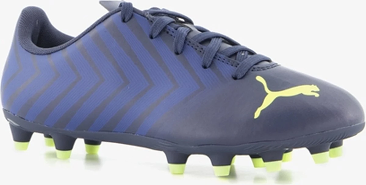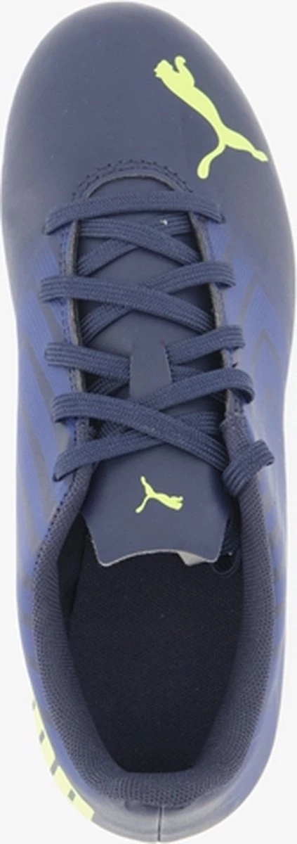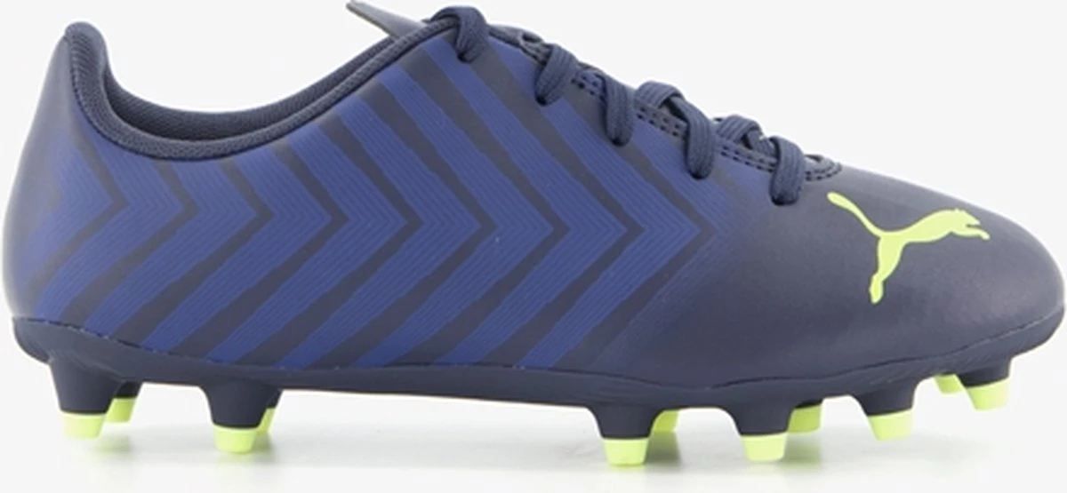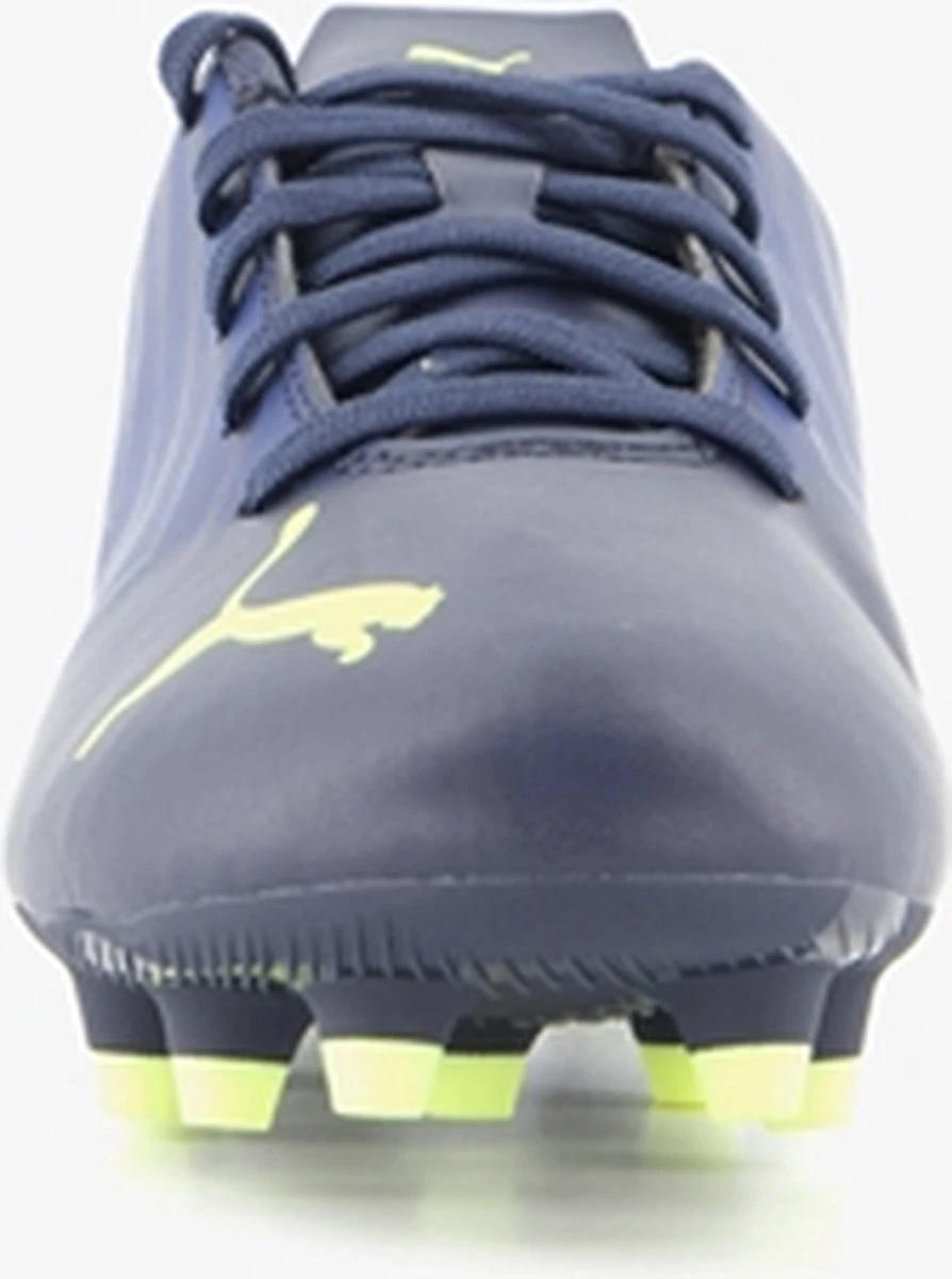 Blauwe Puma Tacto II kinder voetbalschoenen. Gemaakt van imitatieleer, binnenwerk van textiel en een rubberen zool met noppen. De Multiground noppenconstructies is een mix van AG (kunstgras) en FG (natuurgras) noppen. Dit maakt deze schoenen geschikt voor kunst- en natuurgrasvelden. Het bovenwerk is versierd met licht blauwe strepen en een geel merkopdruk. Zool is niet uitneembaar.