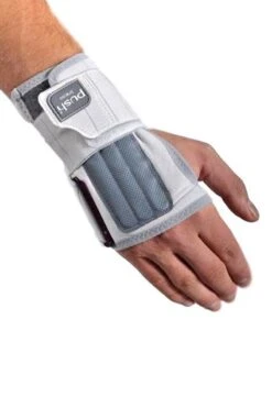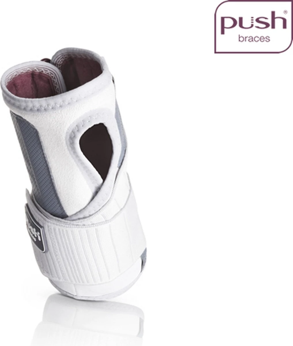 De Push med Polsbrace biedt een hoge mate van ondersteuning en bescherming aan het polsgewricht, zonder daarbij de handfunctie te beperken. De anatomisch gevormde flexibele baleinen limiteren de palmair en dorsaal flexie, zonder deze volledig te blokkeren. Door middel van een eenvoudig aan te leggen elastische band kan de mate van compressie optimaal worden ingesteld. De polsbrace is eenvoudig met één hand rond de onderarm te sluiten.
