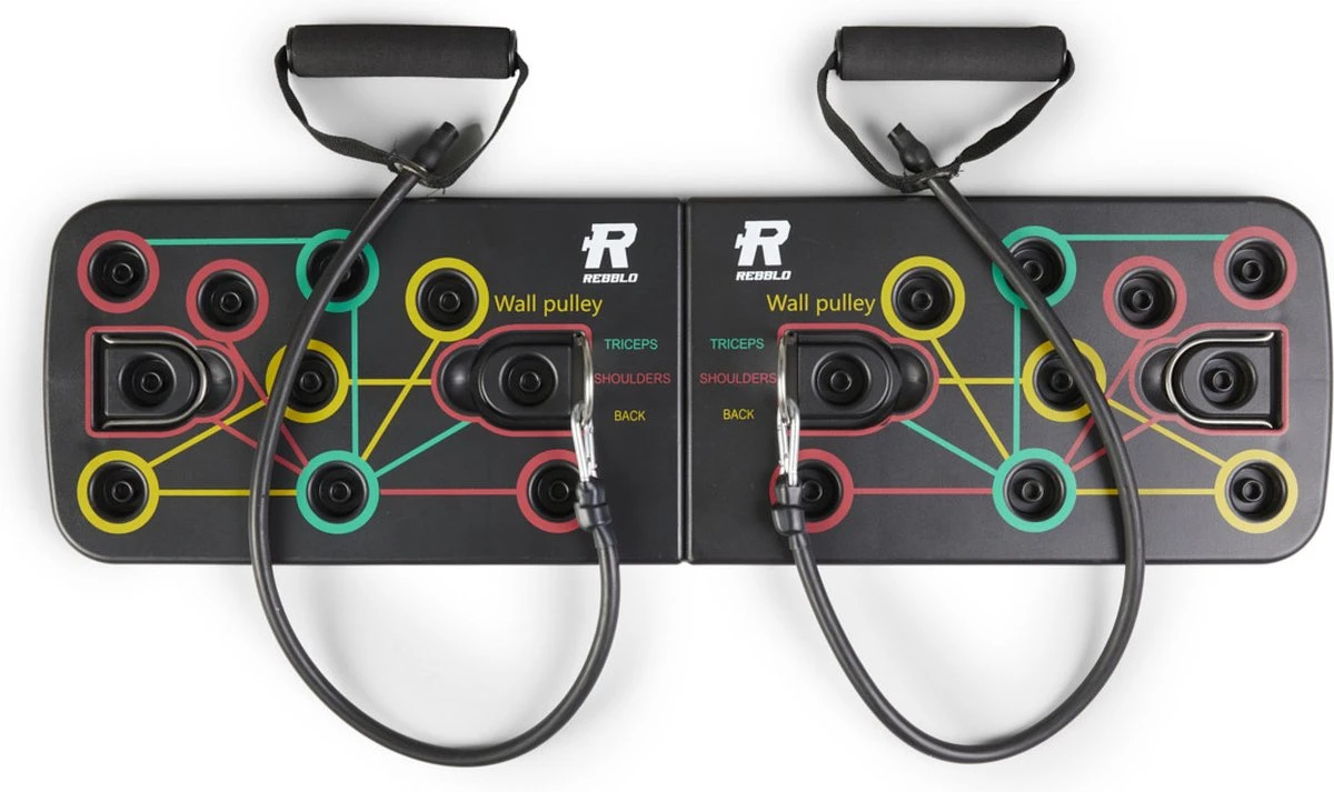 Het push-up board van Rebblo is perfect voor het trainen van het bovenlichaam. Het bord komt met 2 weerstandsbanden en 2 afneembare griphendels. De griphendels passen in het bord met verschillende kleuren. Elke kleur op het bord vertegenwoordigt een andere spiergroep; met rood train je de schouders, met geel de rug en met groen de triceps.