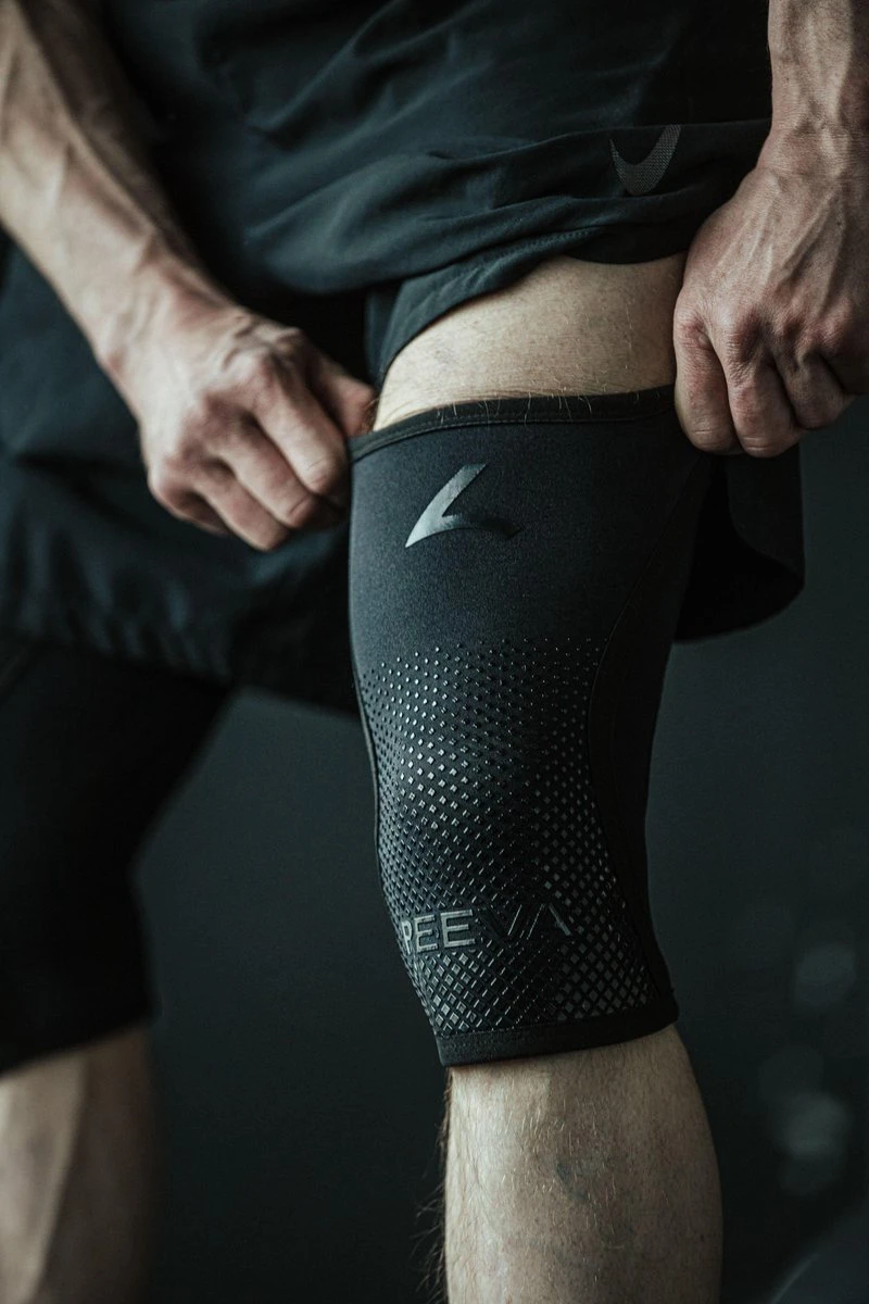 Reeva knee sleeves bieden compressie en warmte. Compressie zorgt ervoor dat de knie in goede richting beweegt bij het uitvoeren van squats, deadlifts en lunges. De spieren stijgen in temperatuur waardoor ze flexibeler worden en de kans op blessures afneemt. De knee sleeves zijn lang genoeg om ze op hun plaats te houden tijdens het uitvoeren van bewegingen. De knee sleeves zijn 5 mm dik voor medium ondersteuning.