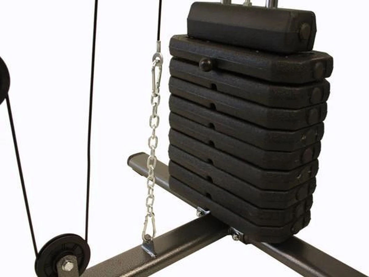 wordt geleverd inclusief 45KG gewichtsblokken. Tijdens de training wordt het gewicht verdubbelt door het ingenieuze katrollersysteem. Hierdoor traint u bij vele oefeningen dubbel zo zwaar en kunt u trainen tot 100 KG. Verder wordt er een lange en een korte Pully stang bijgeleverd.