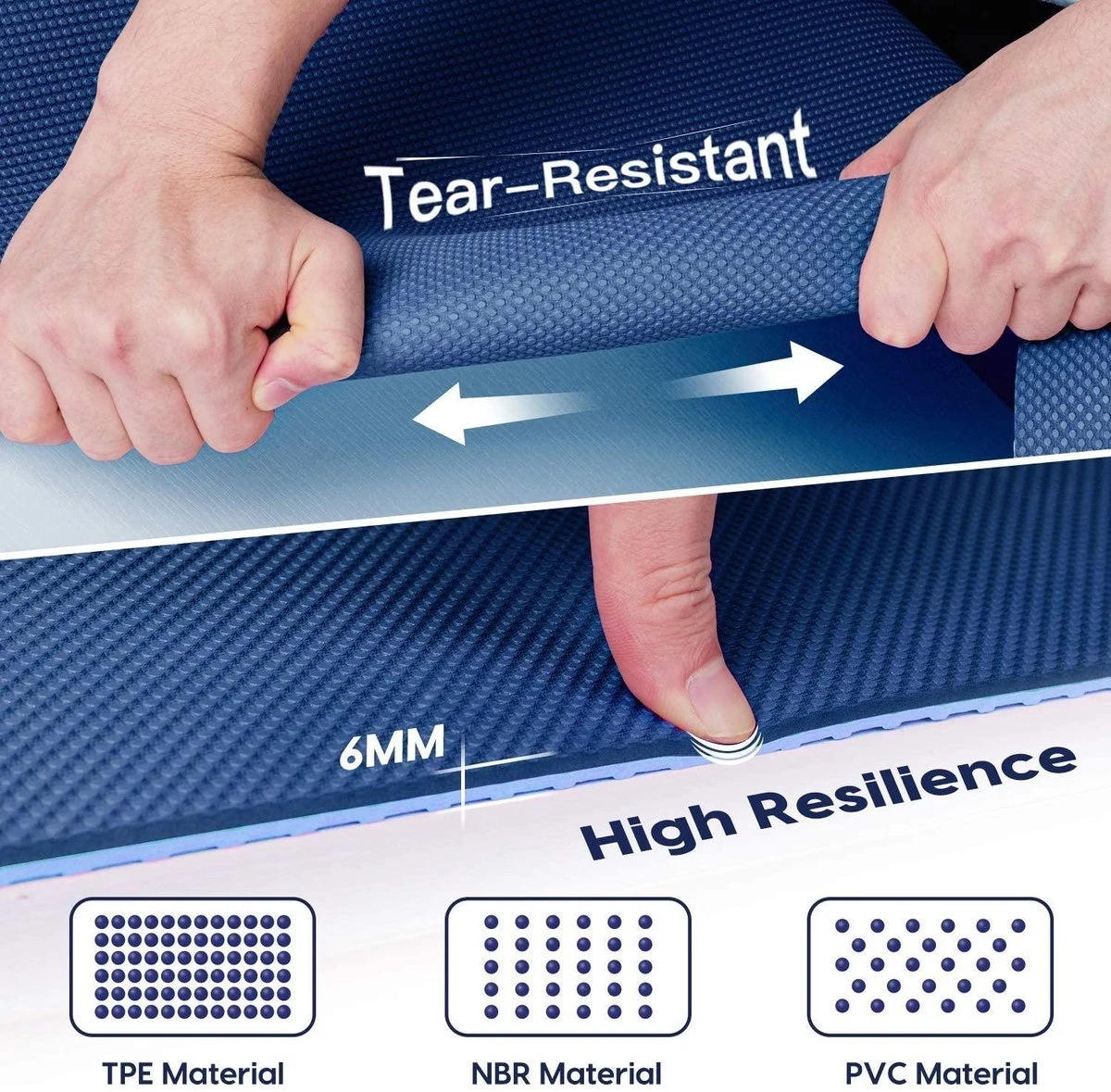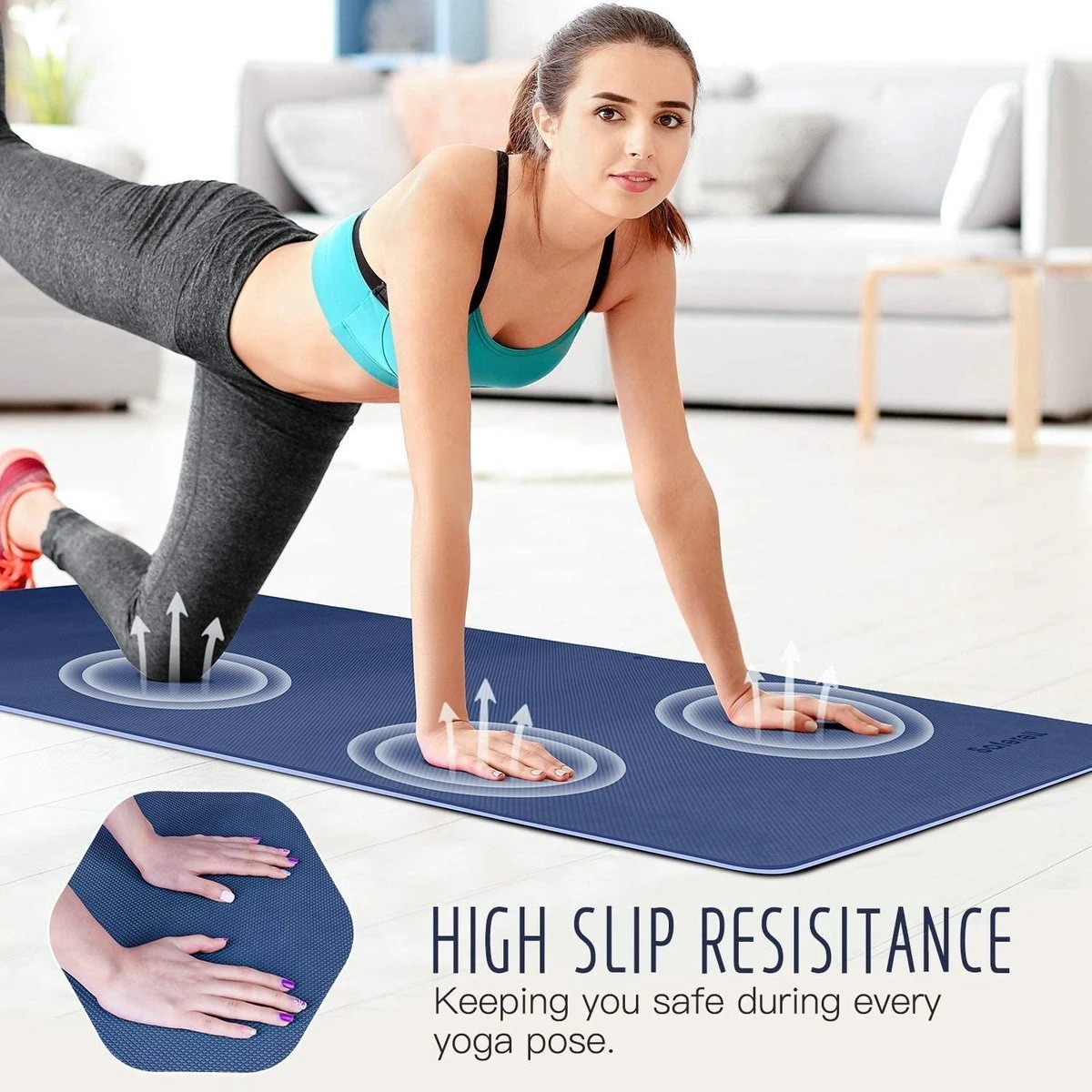 Duurzaam en antislip ontwerp: met geavanceerde compressievormtechnologie is de yogamat duurzamer en scheurbestendig. Aan beide zijden is hij voorzien van antislip punten. De dichte golfpunten aan de voorkant geven je veel comfort en extra slipweerstand. De stippen op de achterkant bieden meer grip en zijn daardoor geschikt voor houten vloeren, keramische vloeren en zelfs betonvloeren.