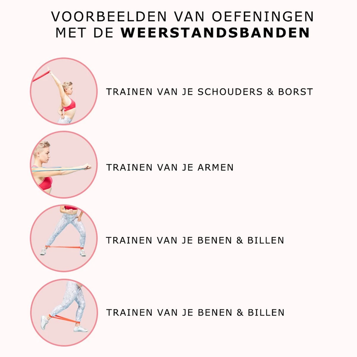 Naast het trainen van je onderlichaam zijn de weerstandsbanden ook functioneel tijdens het trainen van je bovenlichaam. De elastieken zorgen bijvoorbeeld voor het versterken van je schouders of het trainen van je armspieren. Ook kun je de fitnesselastieken gebruiken voor het verlichten of juist verzwaren van oefeningen, zoals bij squats, lunges of bench press oefeningen.