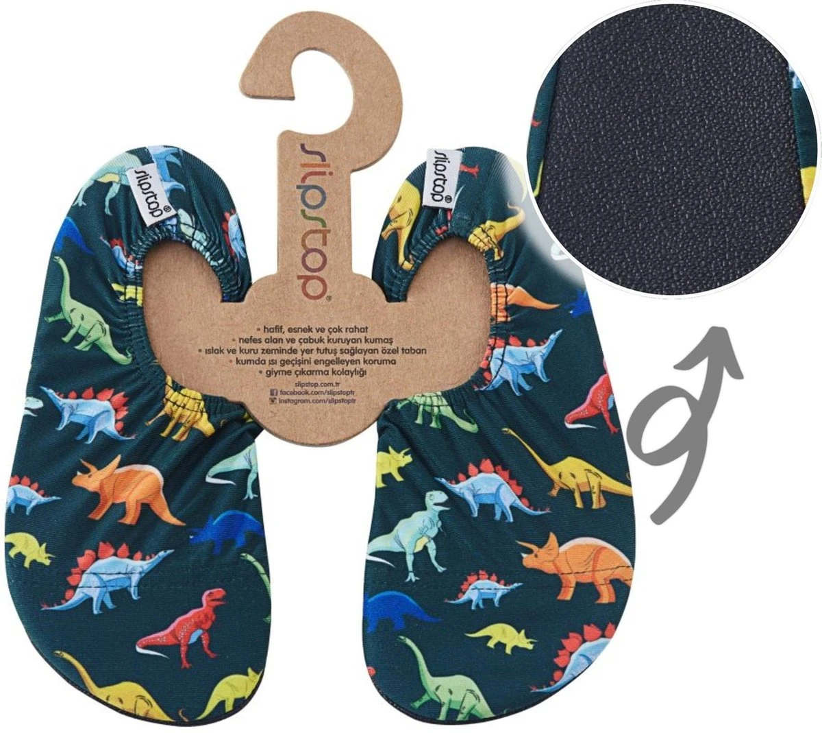 Slipstop Dino – Donker blauw groen met dinosaurussen De Slipstop Dino is één van de hardlopers van Slipstop. Door de dino’s is een van de lieverlings waterschoenen jongen gok ik.