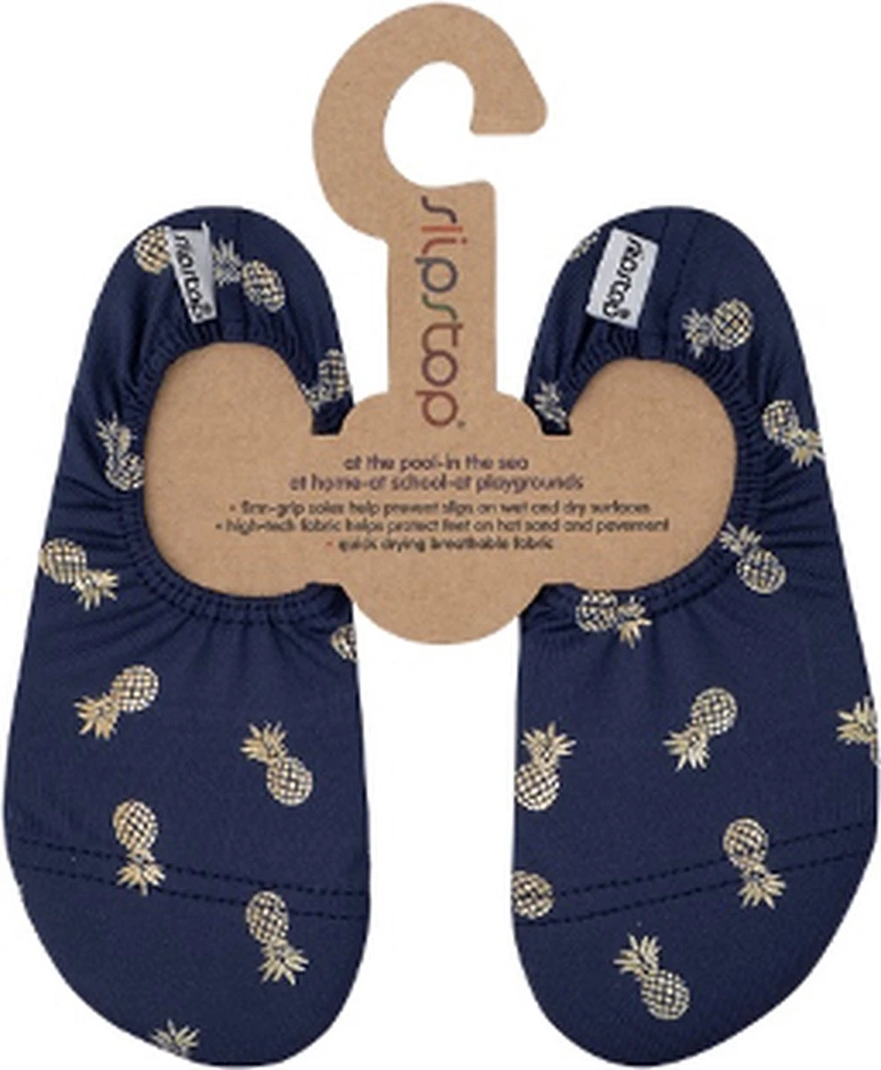 Slipstop Pine – Donker blauwe waterschoenen met goude ananasjes Deze donker blauwe waterschoenen voor meisjes met goude ananasjes zijn dé favoriet onder de meisjes Slipstopshoes. Slipstop Pine is neutraal donker blauw en toch bijzonder door de goude ananasjes. Daardoor kunnen deze waterschoenen voor meisjes onder elk outfit.
