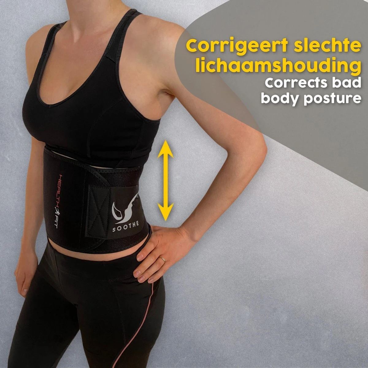 Door het dragen van de waist trainer wordt de lumbale wervelkolom, de onderrug, ondersteund. Dit vermindert rugklachten, de kans op blessures en verbetert de zithouding.