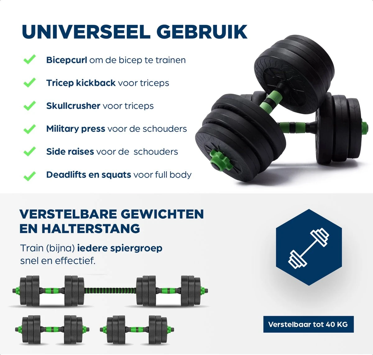 Let op: met een dumbells set van 40kg kan je 2 halters van 20kg maken. Niet 2 halters van 40kg.
