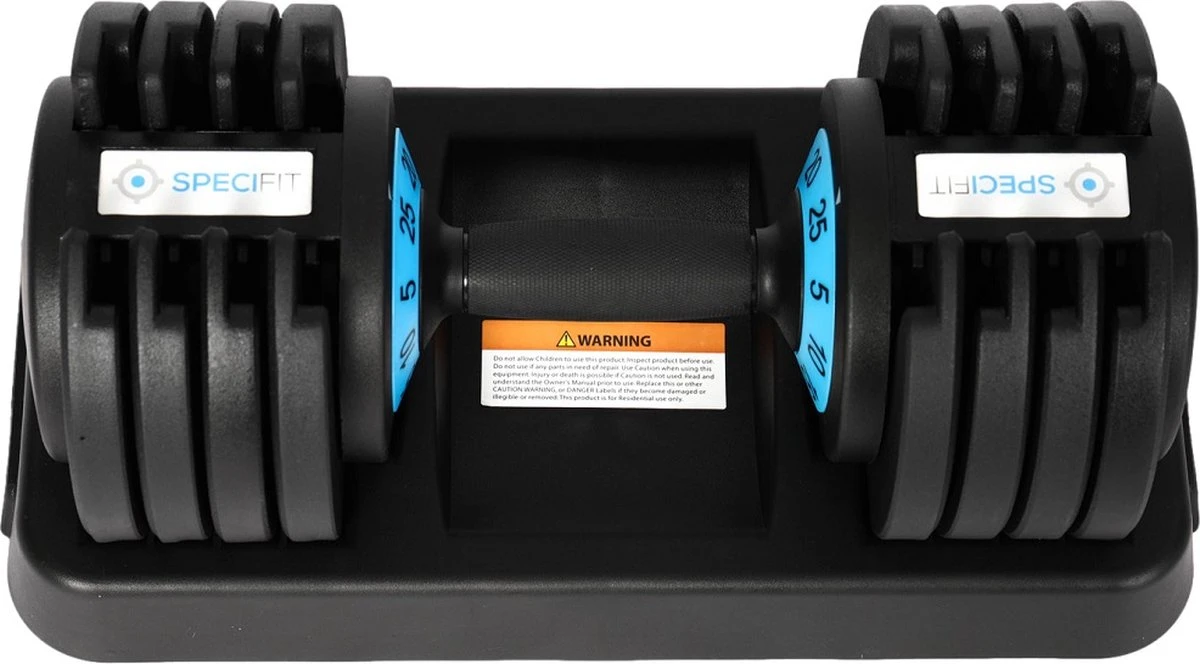Deze dumbell kun je namelijk instellen op 5 verschillende gewichten variërend tussen 2,3 KG en 25 KG.