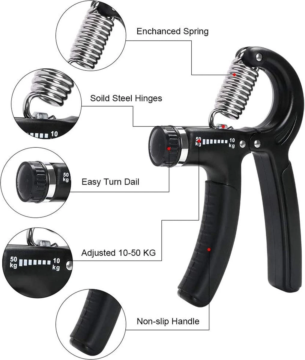 · 【Versterking van kracht】door in de verstelbare handgreep te drukken worden alle spieren in uw vingers, handen en onderarm getraind.
