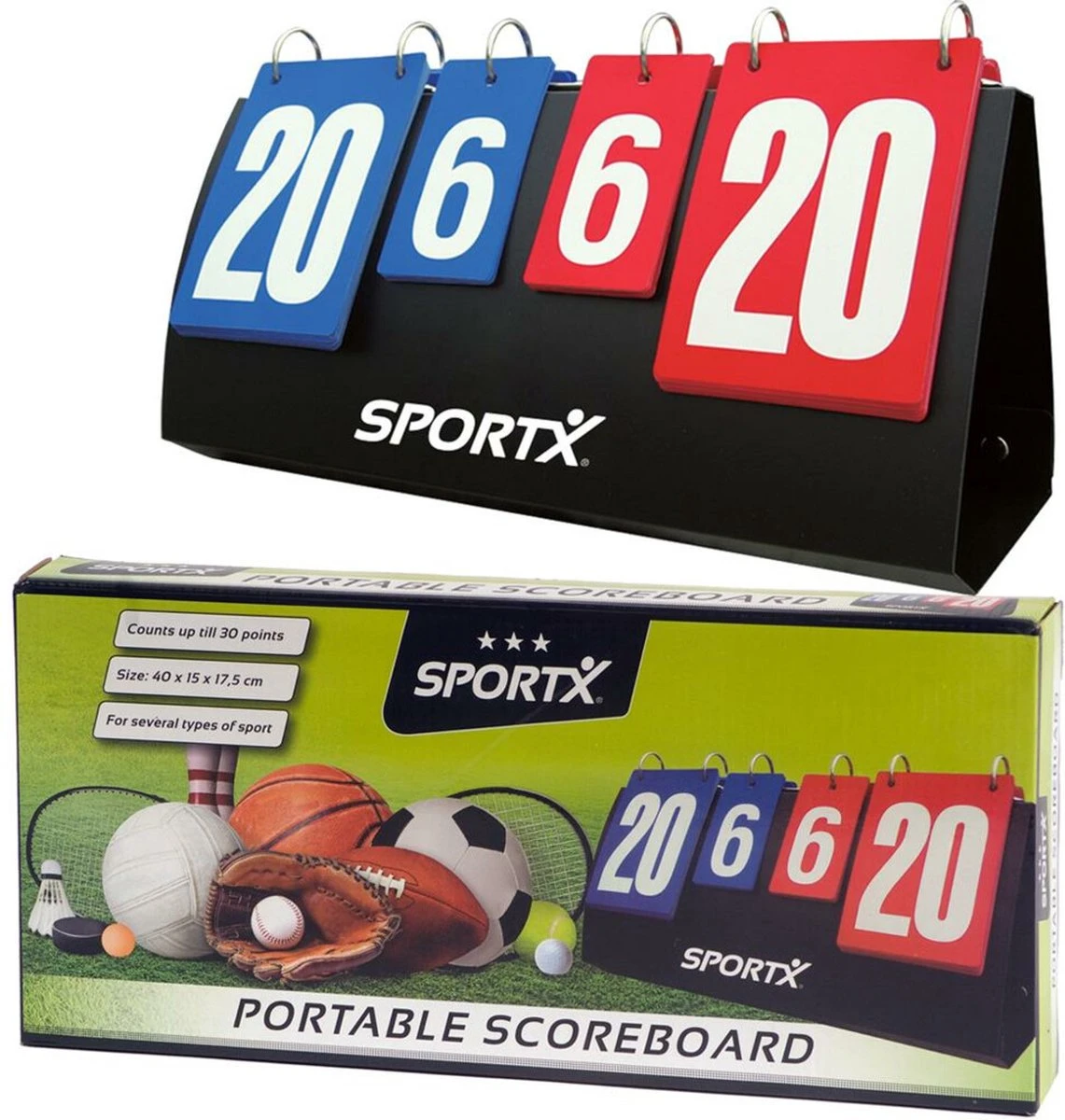 SportX scorebord. Voor het bijhouden van bijv. de score van een volleybalwedstrijd. Met handig design: gesloten zitten de cijfers keurig aan de binnenkant, en opengeklapt kan het scoreboard neergezet worden. Telt tot 30 punten. Met knoopsluiting.