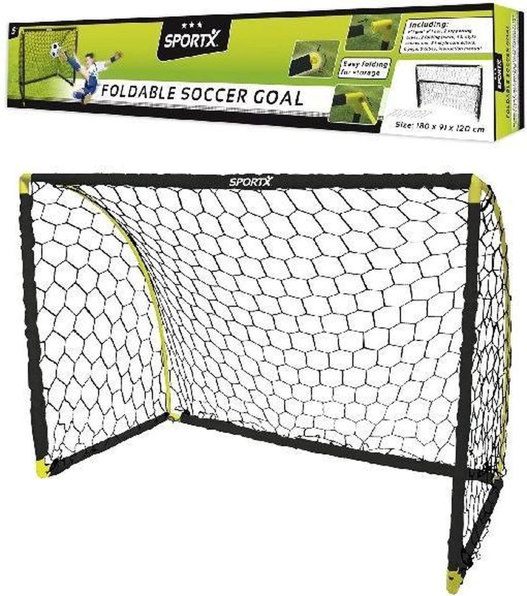 SportX voetbaldoel, met een superhandig vouwsysteem. Je kunt deze goal dubbelklappen, zodat de goal compact kan worden opgeruimd. Het net is voorzien van een stevige sleeve, waardoor je het gemakkelijk over de buizen schuift. Met duidelijke gebruiksaanwijzing en inclusief 8 haringen. Afmeting: 180 x 91 x 120 cm. Geschikt voor kinderen vanaf 5 jaar.