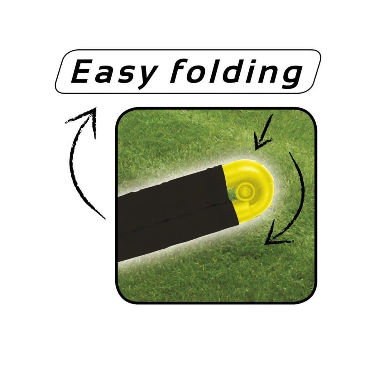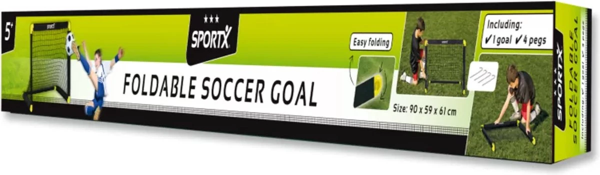 SportX voetbaldoel, met een superhandig vouwsysteem. Op de hoekpunten van deze goal zit namelijk een scharnier. De goal wordt volledig gemonteerd geleverd: simpelweg uitklappen, zekeren in de grond met de 4 bijgeleverde haringen, en je bent klaar voor een potje voetbal! Afmeting: 90 x 59 x 61 cm. Geschikt voor kinderen vanaf 5 jaar.