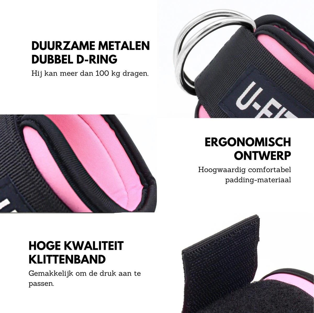 Onze Ankle Straps gebruiken een zweetbestendige, ademende enkelmanchet van neopreen dat prettiger is voor uw lichaam, versterkte stalen dubbele D-ring en dubbele stiksels om langdurige apparatuursterkte en breed bevestigingscomfort te garanderen.