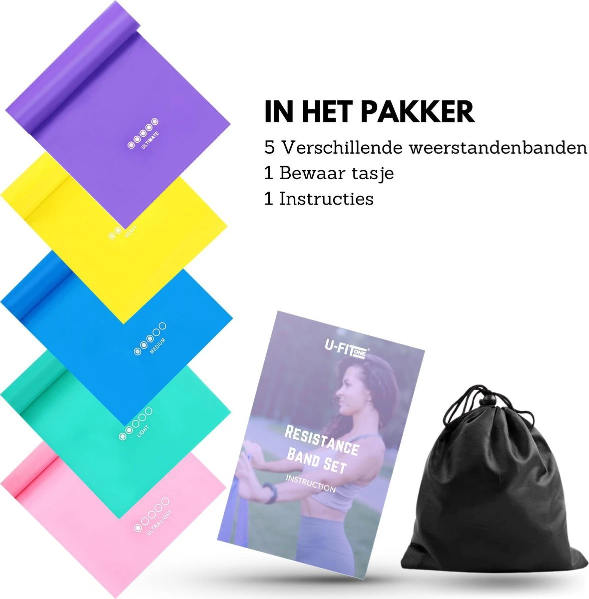 5 x weerstandsbanden met en een Zwart herbruikbare opbergtas met trekkoord. 100% klantenservice en klantenservice.