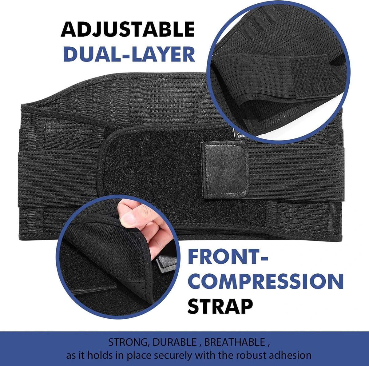 - Verstelbare steunbanden: dubbele verstelbanden zorgen voor een aangepaste pasvorm en compressie. De steunen bieden extra lendensteun.