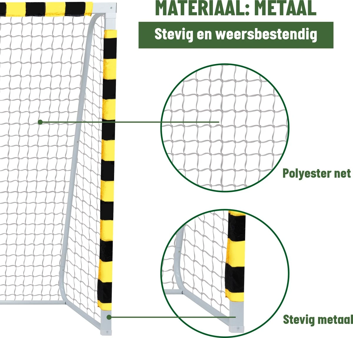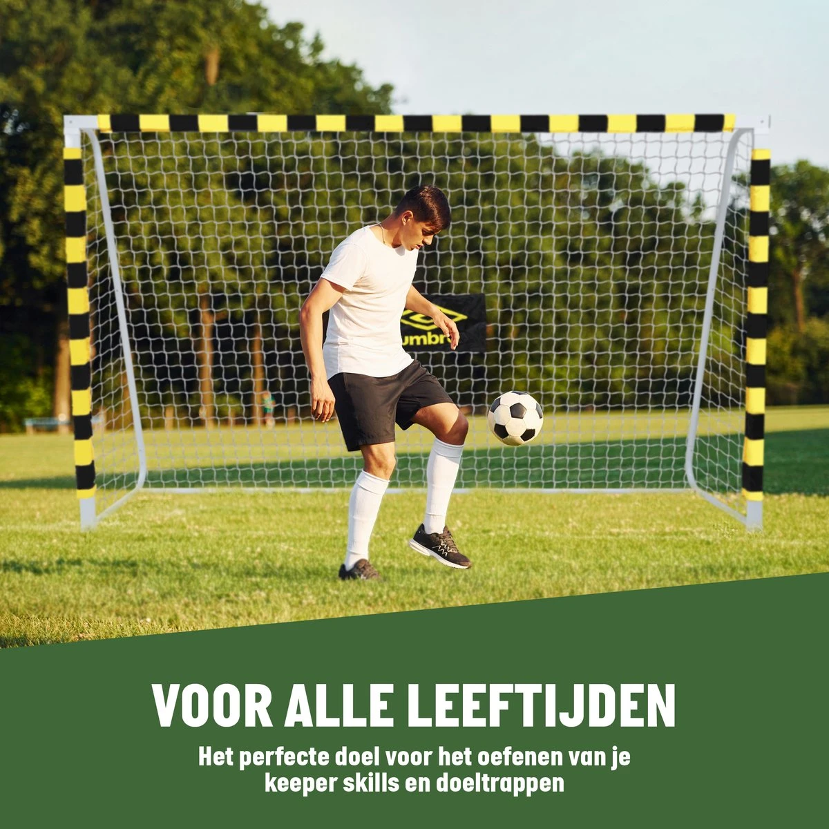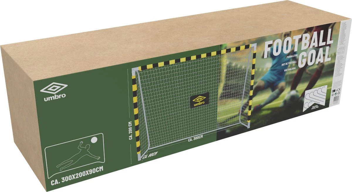 Daag al je vrienden en familie leden uit voor een potje voetbal in de achtertuin met dit ruime voetbaldoel van Umbro. Met zijn ruime afmetingen van 300 x 200 x 90 centimeter is de goal het perfecte voetbaltrainingsmateriaal voor spelers in verschillende leeftijdsgroepen. Dankzij het frame van metaal is het voetbaldoel zeer stevig en zelfs weersbestendig waardoor je hem het hele jaar door buiten kunt laten staan. Door middel van een klik-systeem zet je de goal makkelijk en snel in elkaar. Veranker hem vervolgens met de 7 meegeleverde grondhaken aan de bodem.