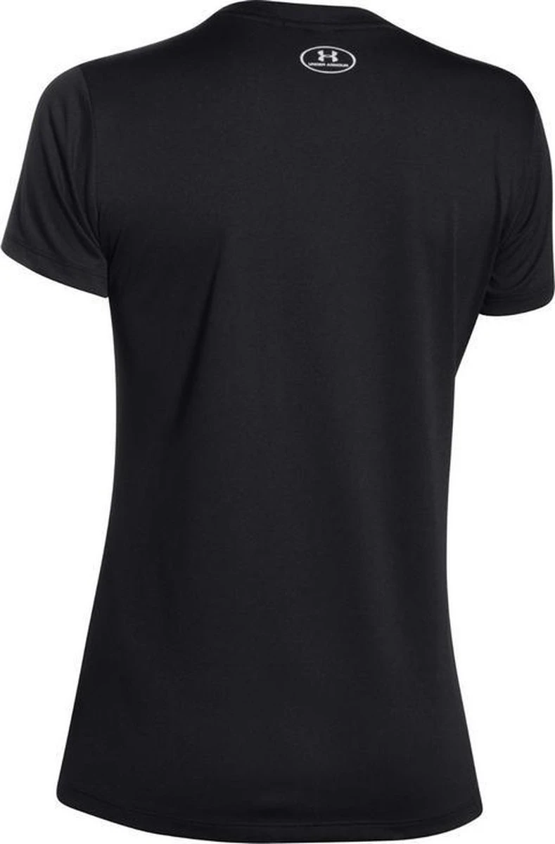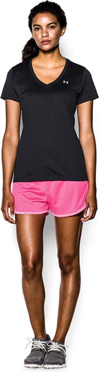 UA Techâ„¢-stof is sneldrogend en voelt zacht en natuurlijk aan;Het materiaal voert zweet af en droogt zeer snel;Materiaal rekt in vier richtingen voor optimale bewegingsvrijheid;Diepe V-hals en nauwsluitende pasvorm zorgen voor een aansluitend, vrouwelijk silhouet;Metallic zilveren logo op de borst