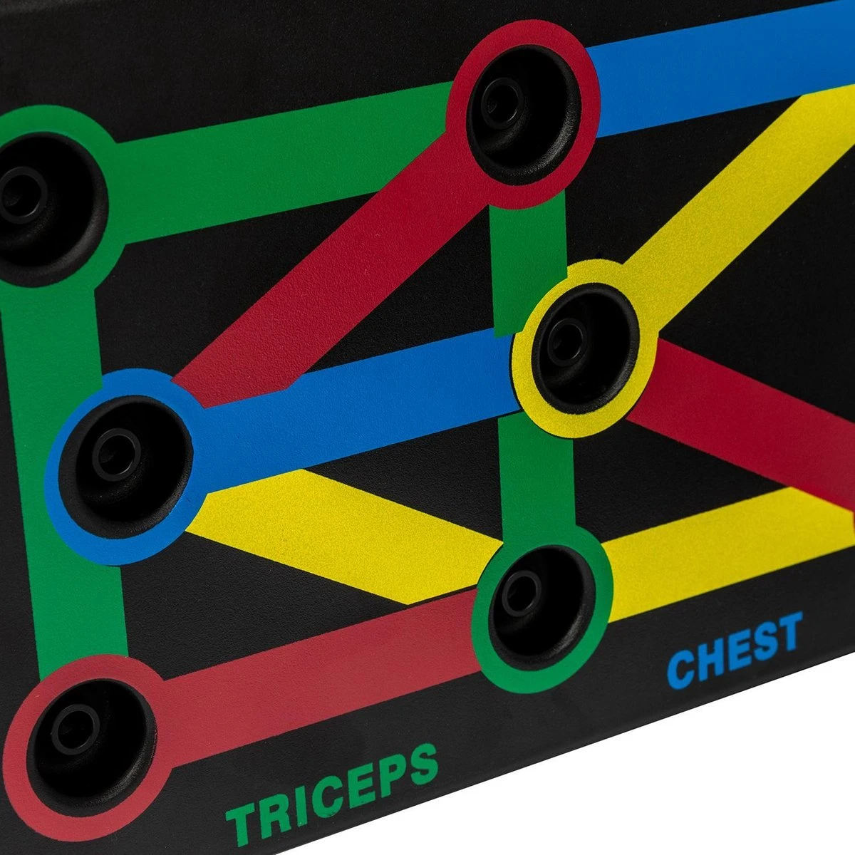 De opdruksteunen kun je maar liefst in 12 verschillende posities zetten. Dit zorgt voor een effectieve krachttraining van het bovenlichaam en geeft je spieren de perfecte vorm. De kleurcodes geven aan welke spiergroepen je aanspreekt: