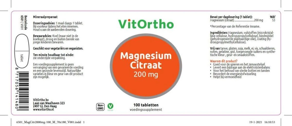 Magnesium Citraat Tabletten 200 mg van Vitortho bevat een hoge dosering magnesium in een goed opneembare en organische vorm. Magnesium betrokken bij heel veel processen in ons lichaam. Magnesium helpt onder andere mee met het behoud van sterkte botten en tanden en is goed voor de spieren.