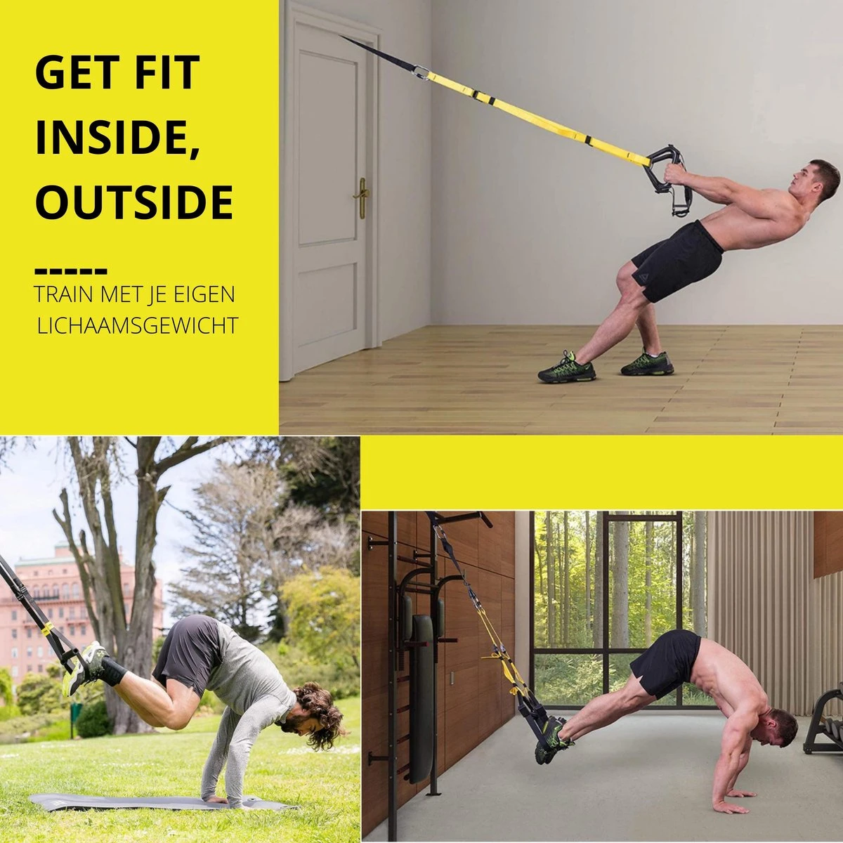 Dankzij de verstelbaarheid is de set geschikt voor iedereen. Daarnaast train je met je eigen lichaamsgewicht en kan je door de uitvoering van de fitness oefeningen de training zo zwaar maken als je zelf wilt.