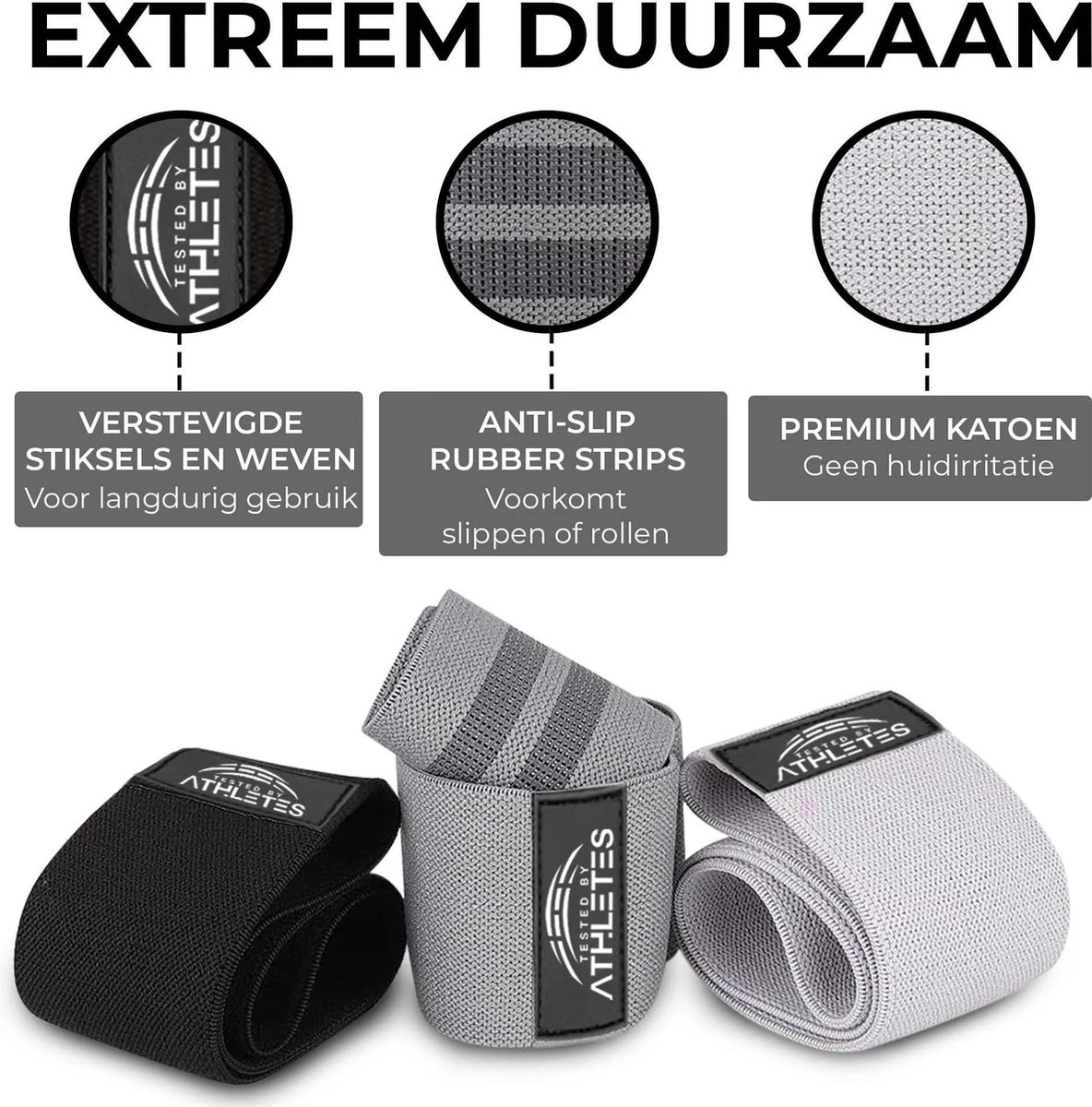 Het materiaal die zijn gebruikt voor onze Weerstandsbanden zijn zeer duurzaam en zijn daarnaast ook zweetbestendig. Hierdoor krijg jij geen irritaties op de huid en kan je gemakkelijk door sporten! Daarnaast hebben wij de Weerstandsbanden gemaakt met een dubbele Anti-Slip laag zodat deze niet af glijden en niet gaan rollen zoals de velen andere Weerstandsbanden. Dankzij de duurzame kwaliteit gaan de Weerstandbanden extreem lang mee en blijft het elastiek in perfecte conditie.