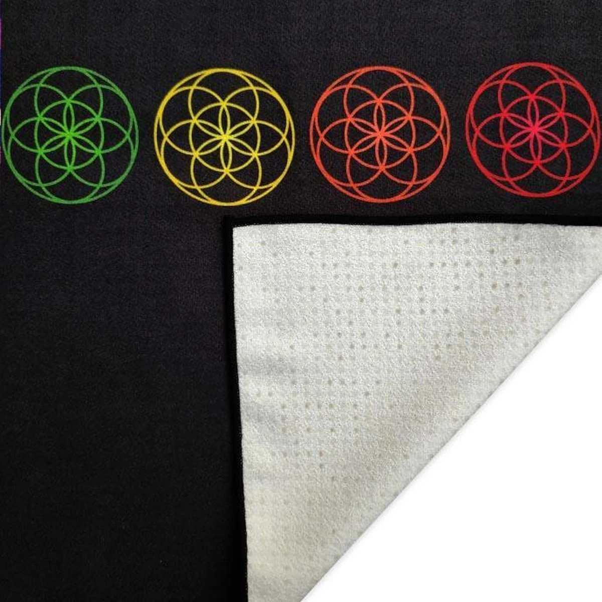 De kleurrijke spirituele prints zijn aanbracht op een zachte microfiber toplaag en zijn ontwikkeld om de ervaring nog meer te kunnen verdiepen. Aan de achterkant zijn gelijkmatige antislip nopjes aangebracht met een technologie die in de USA gepatenteerd is.