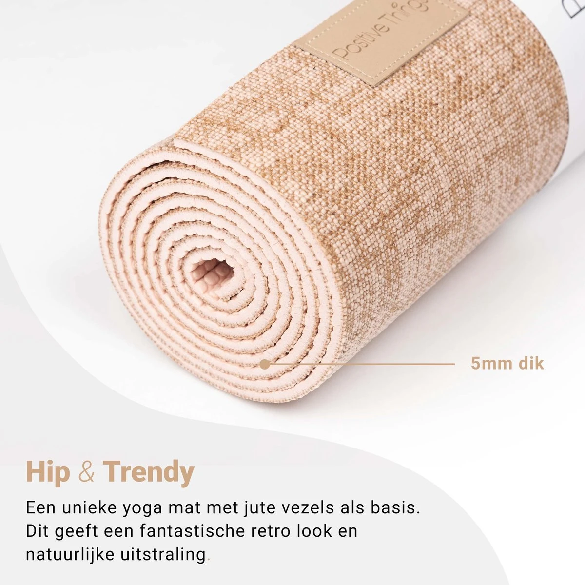 Zoek jij een yoga mat met een zachte en natuurlijke uitstraling maar toch de juiste grip en demping? Dan is dit de mat dé mat die bij jouw past! De bovenkant van onze yoga mat bestaat uit duurzame jute vezels en onderlaag van PVC. Dit geeft de mat een natuurlijke uitstraling met retro touch, maar ook een ideale grip en demping. Deze yoga mat zal niet verschuiven of uitrekken tijdens intense oefeningen.