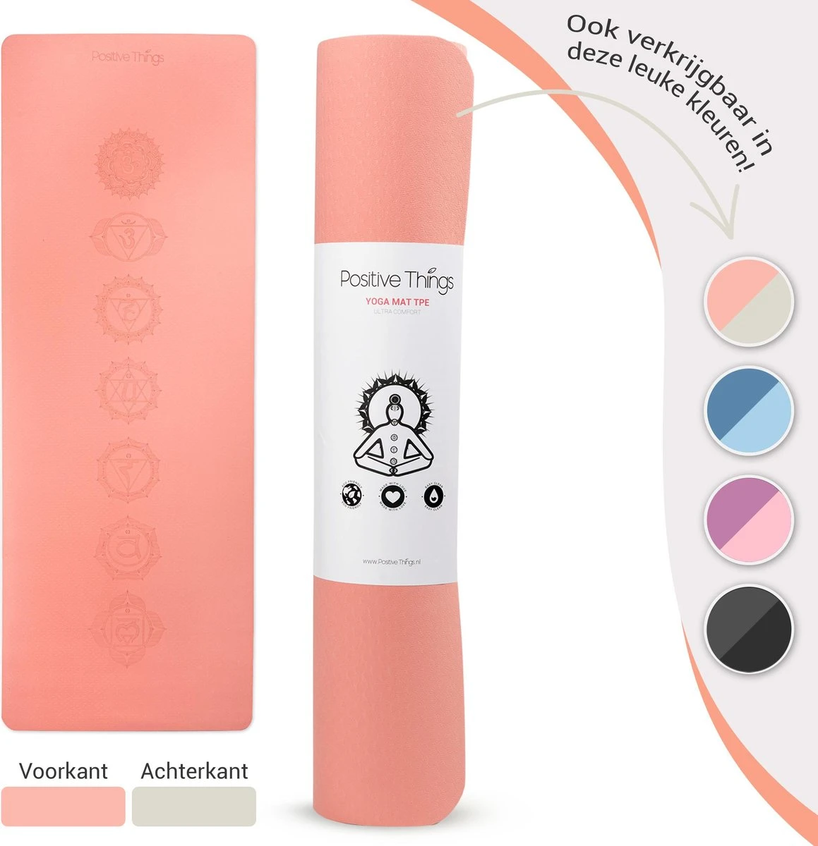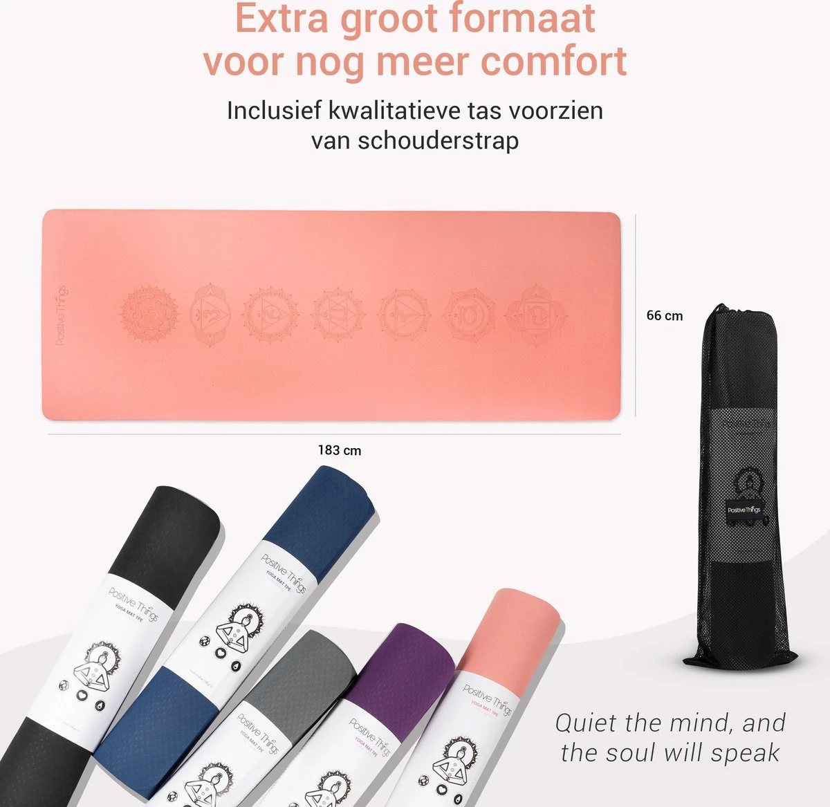 Ben je op zoek naar zeer goede ondersteuning en een zachte ondergrond om yoga poses op uit te voeren? Dan is deze yoga mat van Positive Things helemaal wat je zoekt! Deze yogamat is gemaakt van de hoogste kwaliteit TPE waardoor hij zeer comfortabel en stevig is.