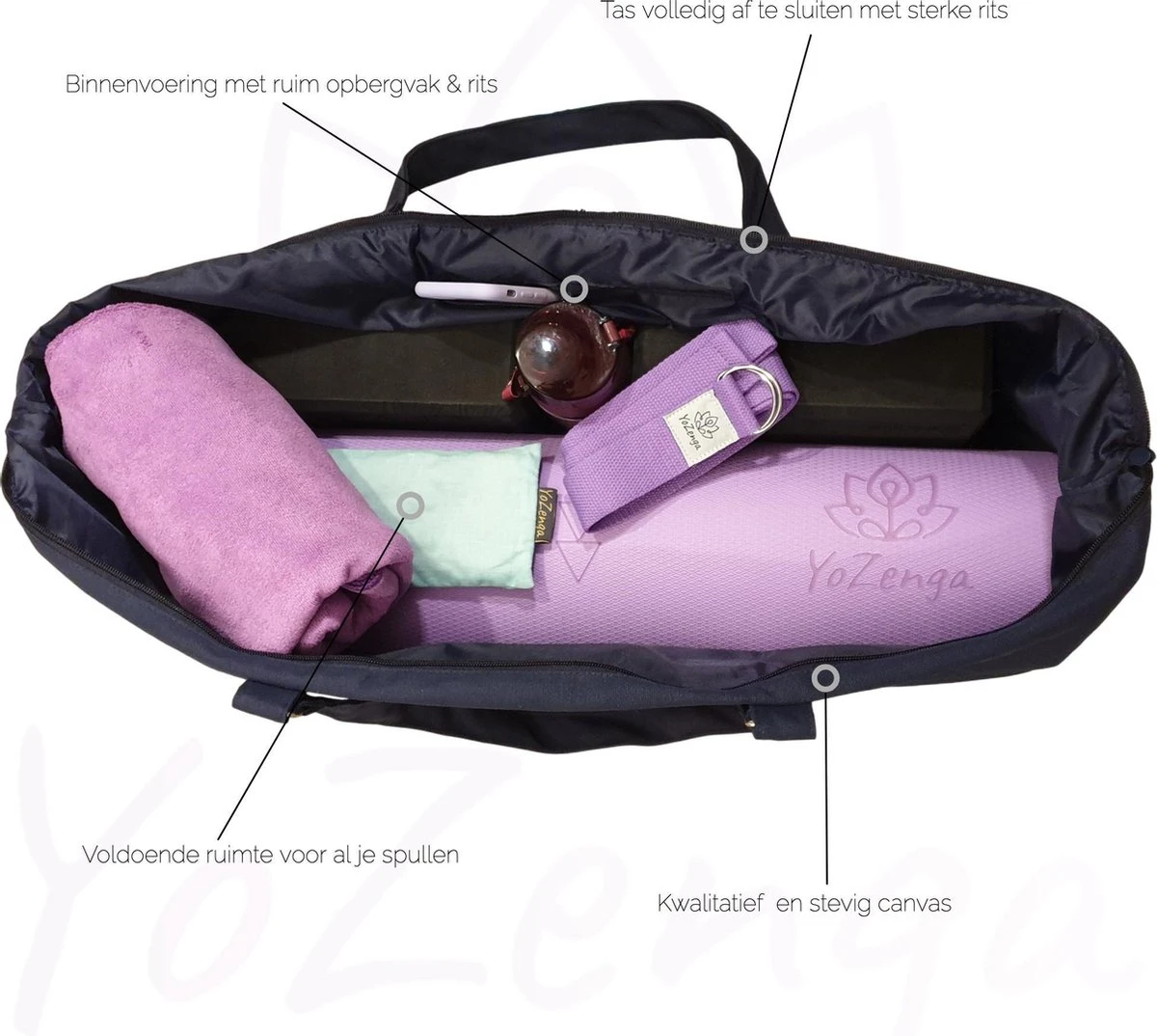 Deze unieke yogatas is groot en breed genoeg om al jouw yoga- en sportspullen in mee te nemen. Naast je mat is er voldoende ruimte om ook yogablokken, drinkfles, handdoek en andere benodigdheden mee te nemen. De tas heeft een stevige rits over de gehele lengte waarmee je de tas volledig kan afsluiten en is gevoerd in een bijpassende kleur. Aan de binnenkant zit een opbergvakje met rits waarin je je persoonlijk spullen kunt opbergen. De tas heeft comfortabele schouderbanden waardoor je hem gemakkelijk over je schouder kan dragen. Door de ruime inhoud kan deze tas ook als sport- of weekendtas gebruikt worden.