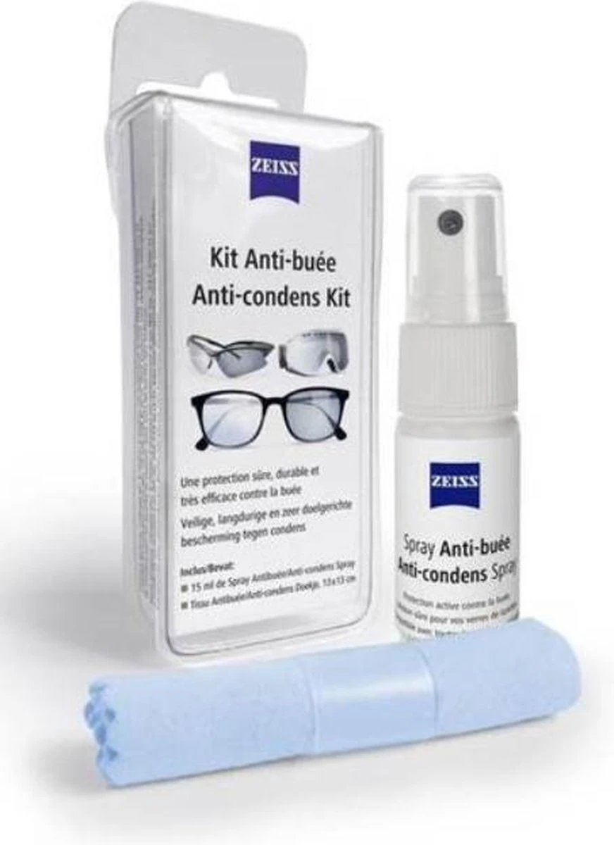 Breng de Zeiss anti-aandamp spray aan op beide zijden van de brillenglazen en wrijf met bijgevoegd doekje om de substantie egaal te verdelen. Wrijf lang genoeg met het bijhorend anti-fog doekje zodat de substantie volledig verdwenen is. Gebruik de zachte kant van het anti-fog doekje.