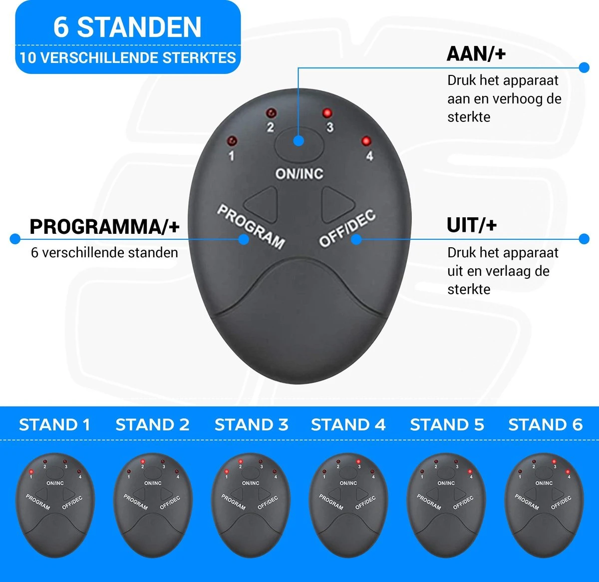 De buikspiertrainer bevat elektroden die je op verschillende spieren plaatst. Deze elektroden zijn verbonden met de afstandsbediening en stuurt elektrische impulsen naar de spieren. de ems trainer bevat wel 6 verschillende standen die allemaal van intensiteit veranderd kunnen worden. Begin als beginner niet meteen op de hoogste stand, maar bouw het rustig op.
